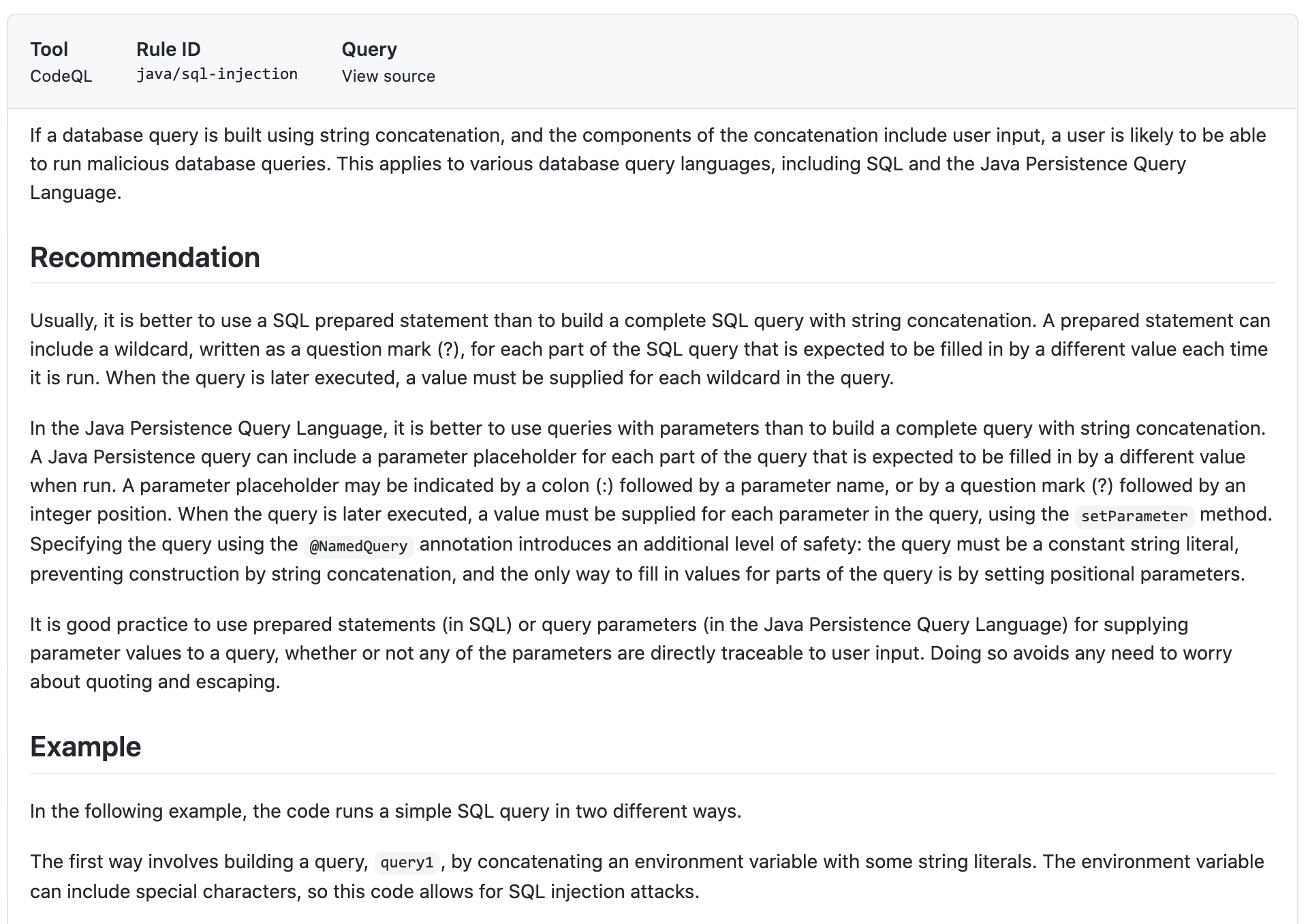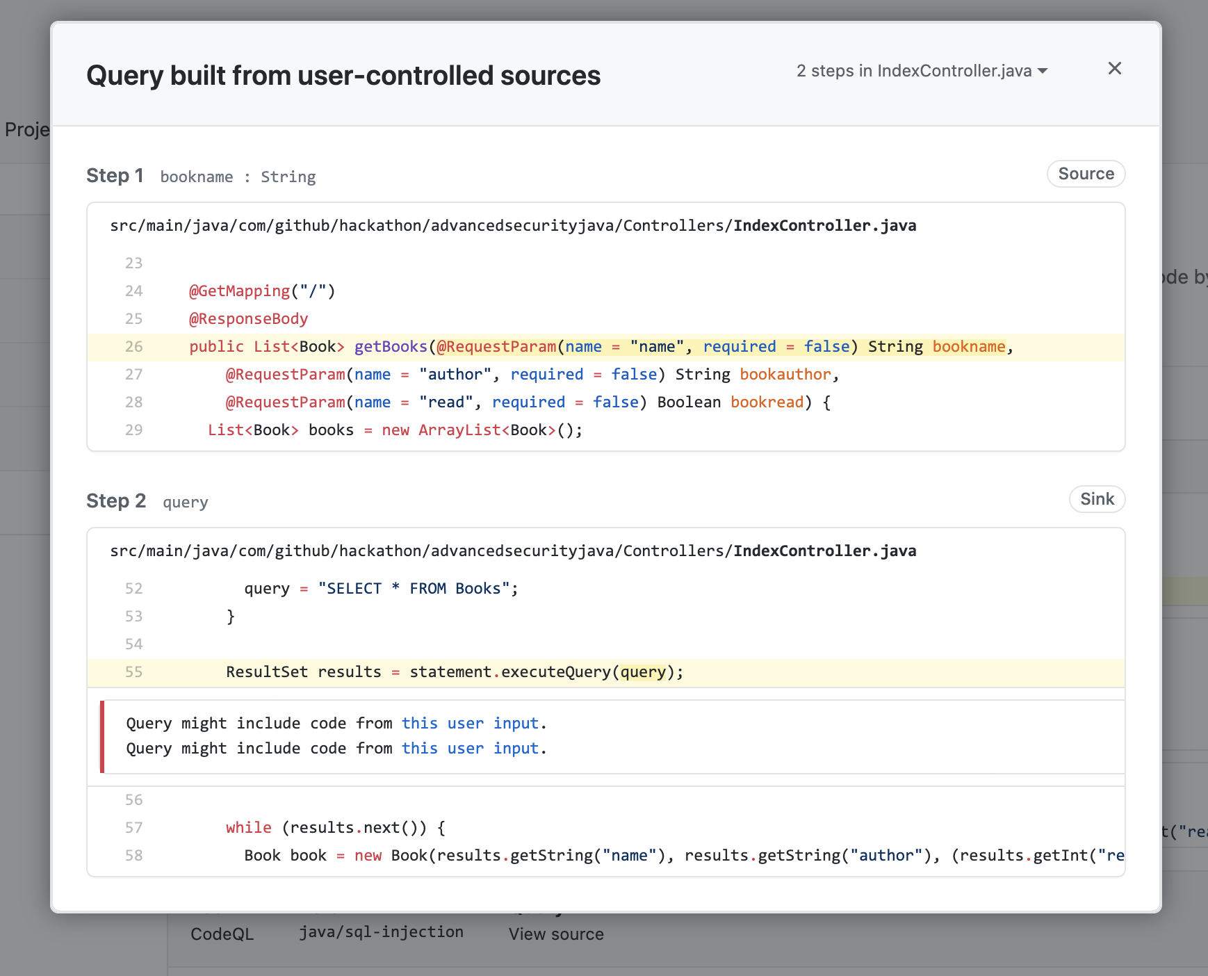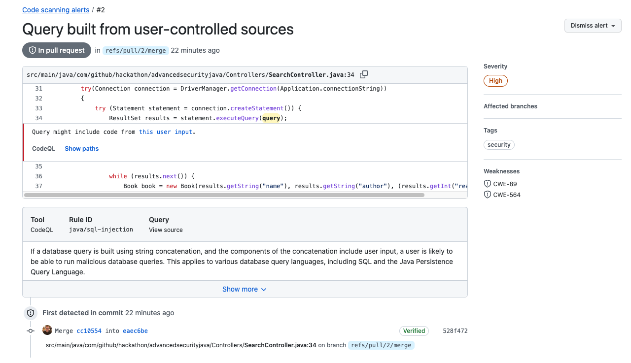 코드 스캔 Java 튜토리얼에 오신 것을 환영합니다! 이 튜토리얼을 사용하면 Github Advanced Security : Code Scanning을 설정하는 방법을 설정하고 찾을 수있는 결과를 해석합니다. 다음 저장소에는 데모 목적을위한 SQL 주입 취약성이 포함되어 있습니다.