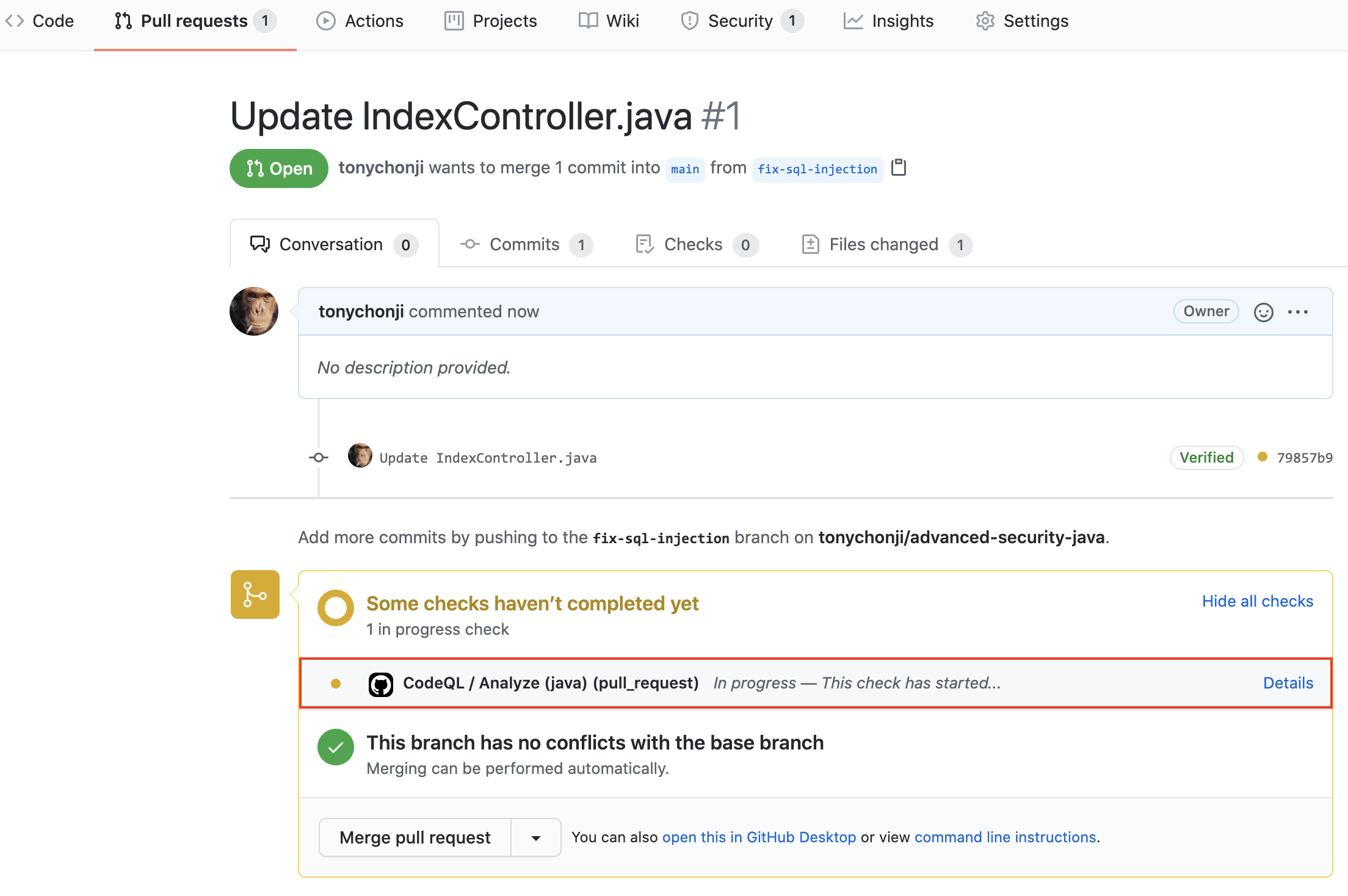 풀 요청에서 CodeQL 분석이 상태 검사로 시작되었음을 알 수 있습니다. 완료 될 때까지 기다리십시오.