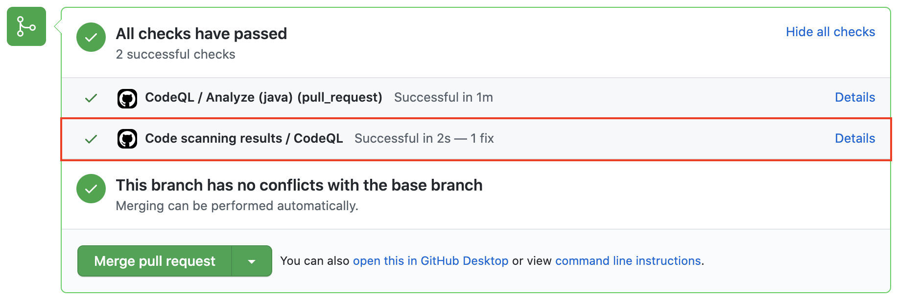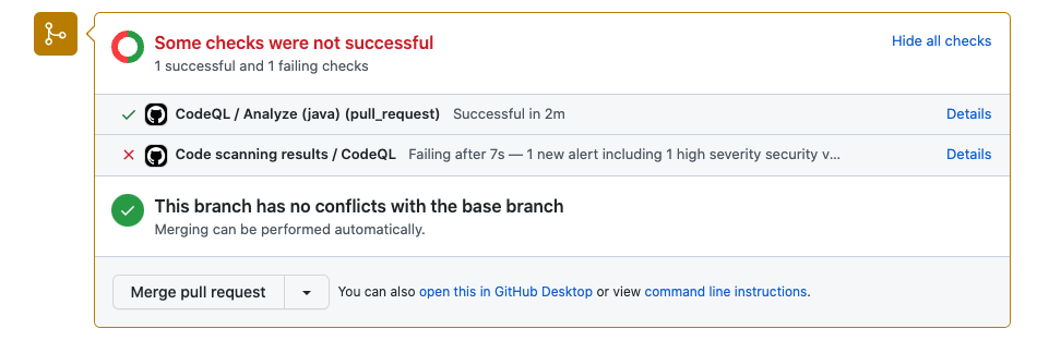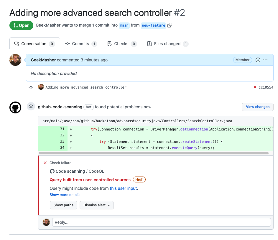 CodeQL 분석을 설정하고 보안 경고를 수정 했으므로 풀 요청에 경고를 도입하려고 시도 할 수 있습니다.