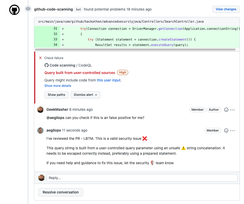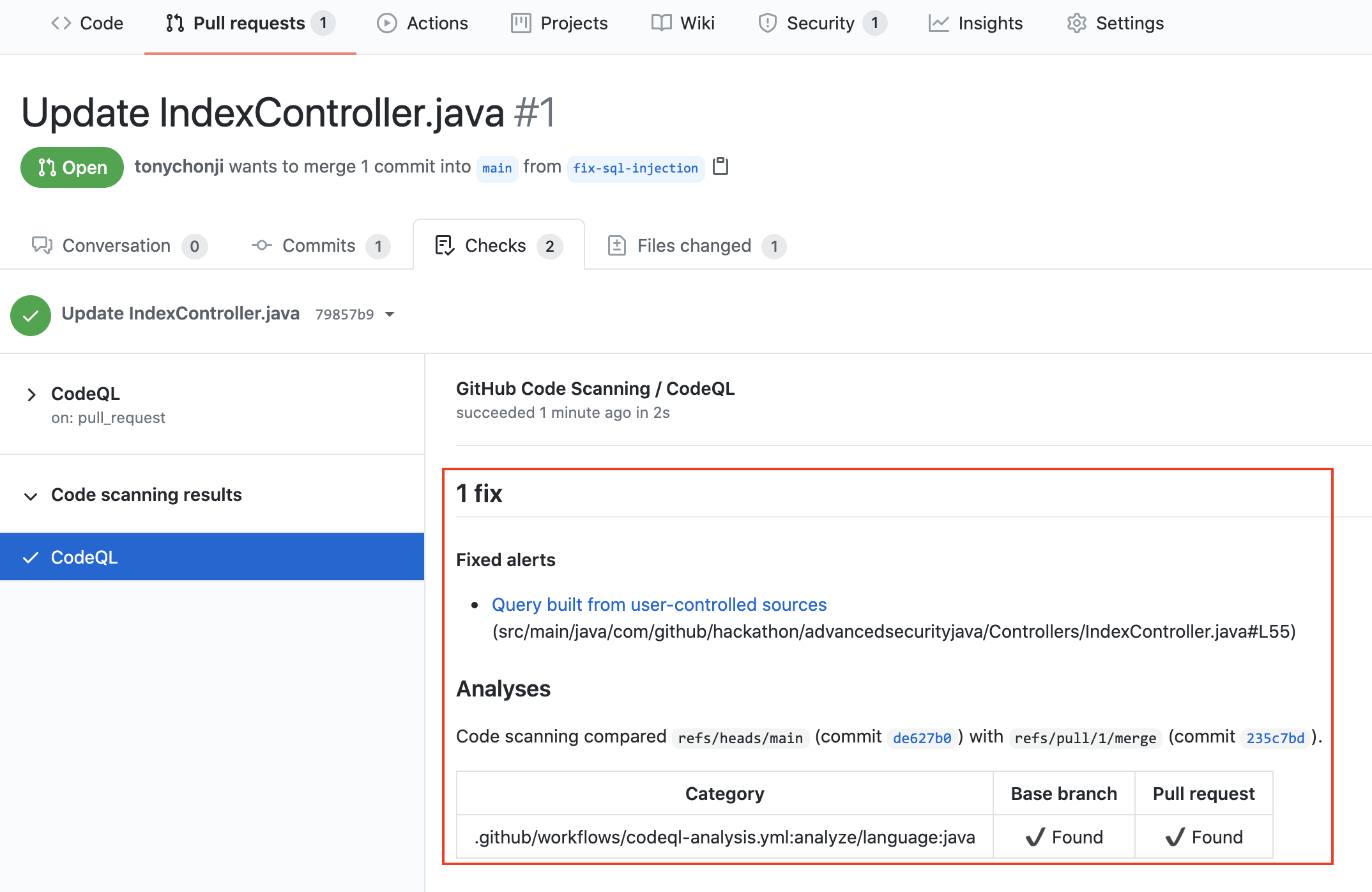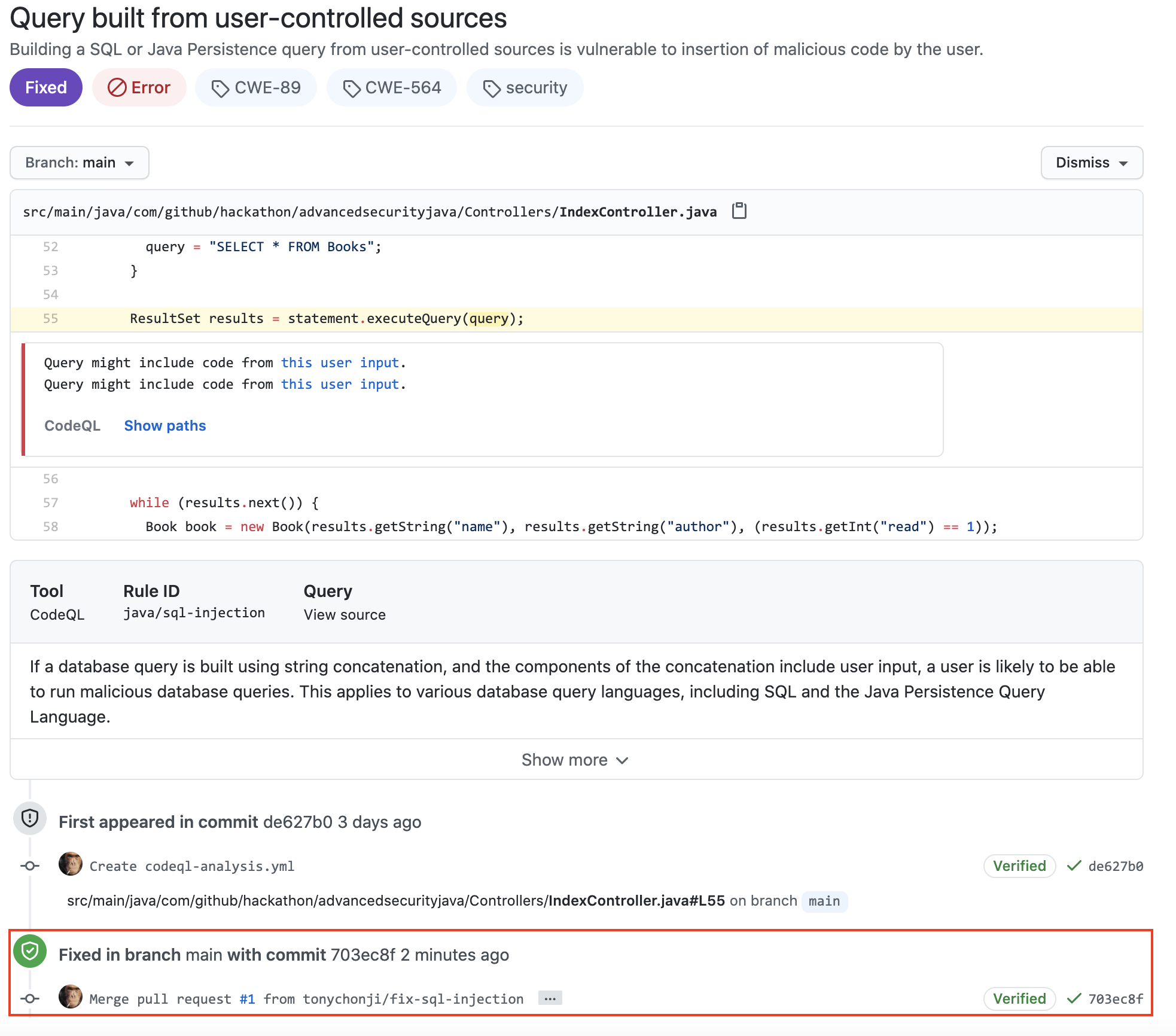 코드 스캔은이 풀 요청이 이전에 감지 된 SQL 주입 취약성을 수정하는 것을 감지했습니다.