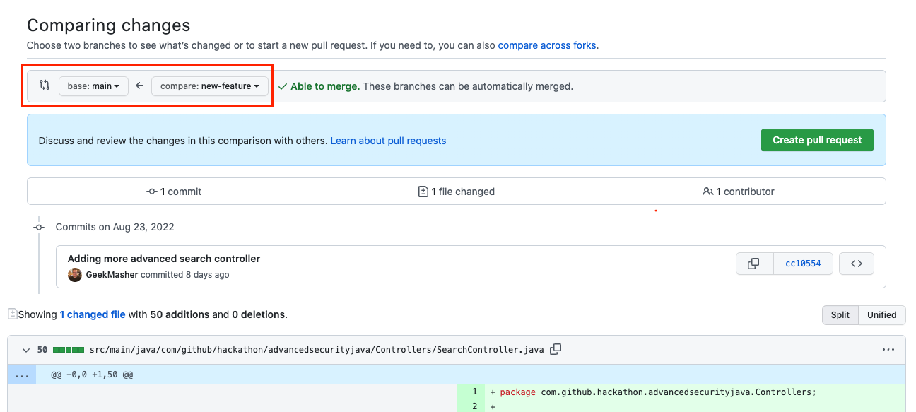 기본 브랜치로 main 브랜치로 새로운 풀 요청을 작성하고 new-feature 분기로서 비교 분기를 만듭니다.