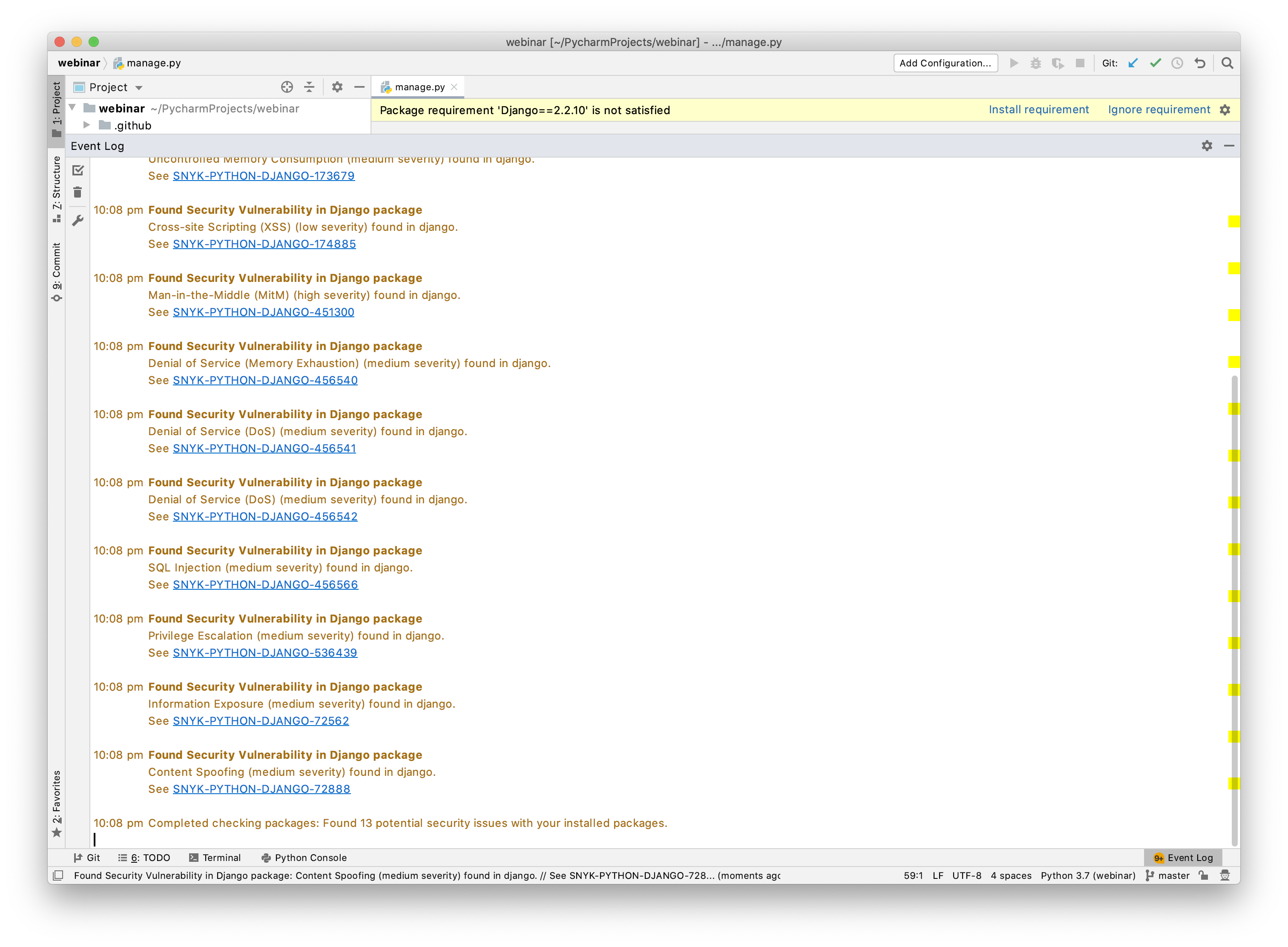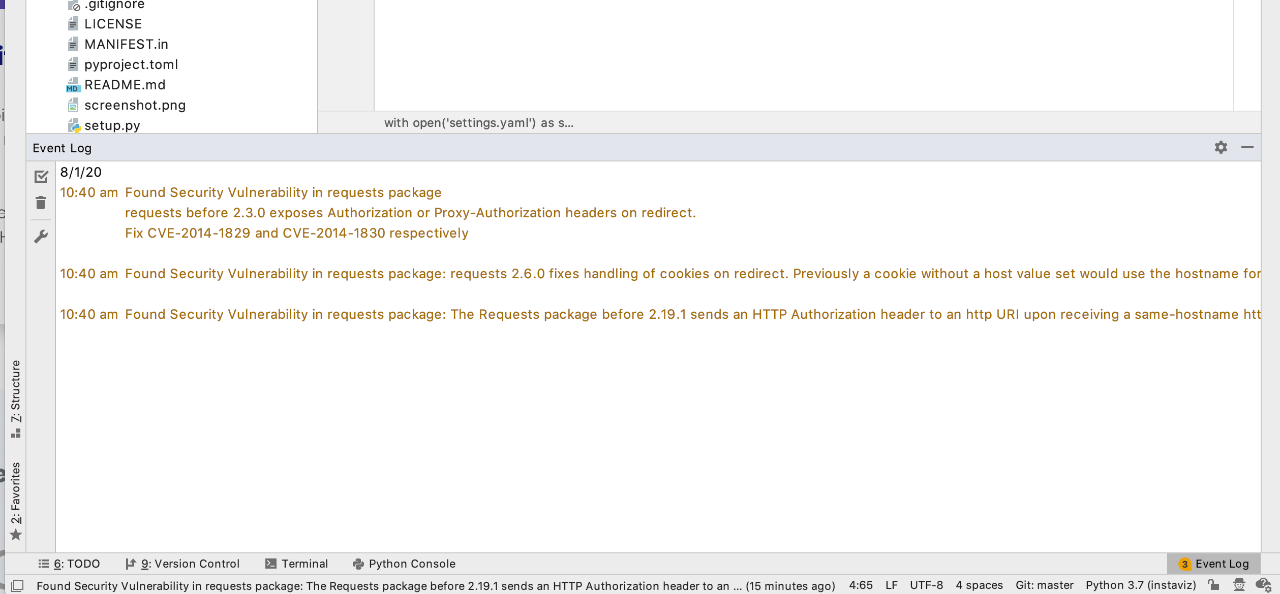 이 플러그인은 Python 프로젝트에 SafetyDB에 대한 설치된 패키지를 확인하고 모든 취약점에 대한 경고를 제기합니다.
