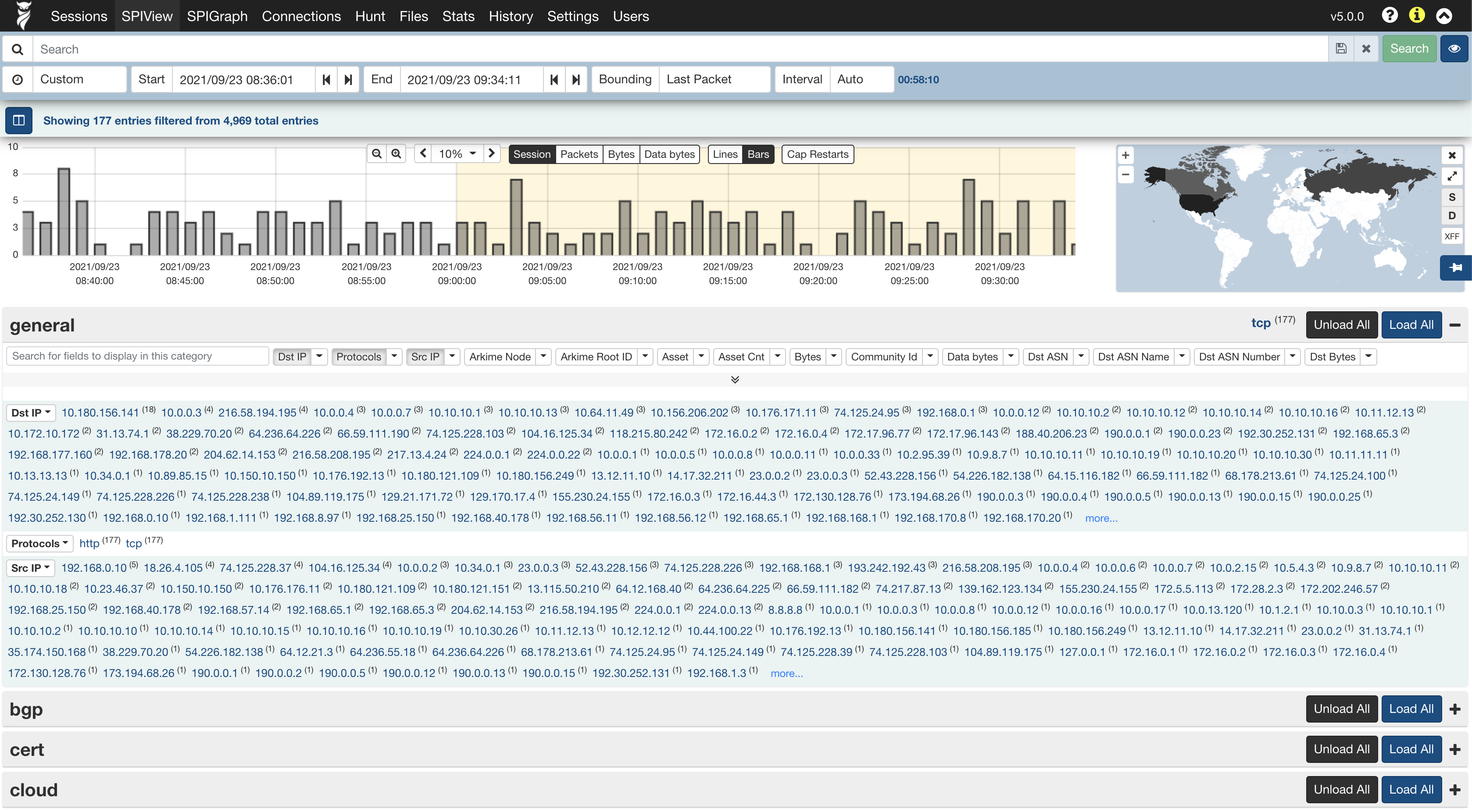 A página de visualização do SPI oferece uma quebra detalhada de dados, exibindo todos os valores exclusivos para cada campo reconhecido pela Arkime