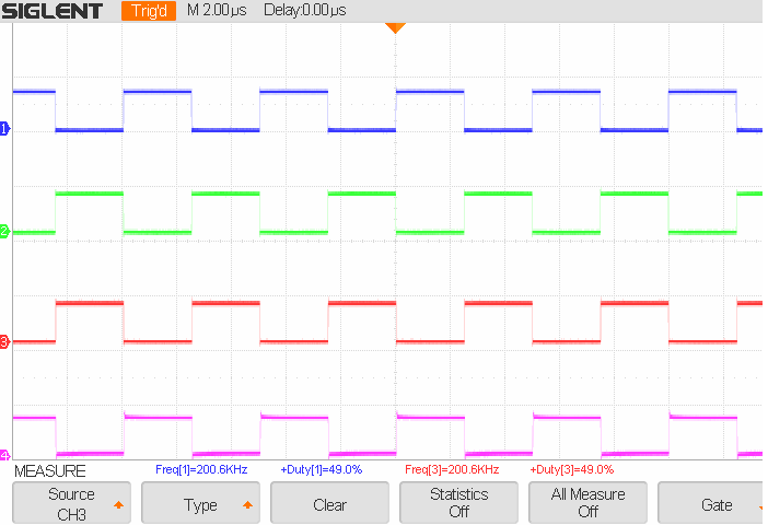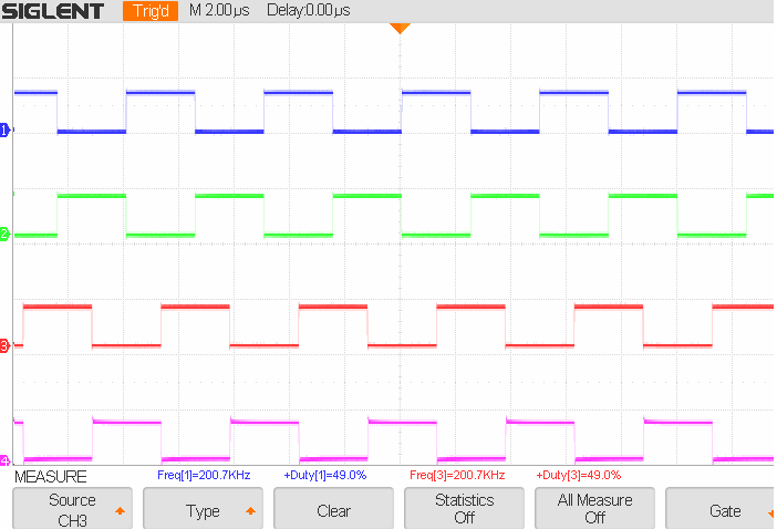 Depois que o dispositivo foi programado e o MCU é iniciado, uma mudança de fase de 90 graus entre os dois geradores PWM sincronizados é gerada, veja abaixo a captura de tela. O Gerador PWM #1 e o #3 são configurados no modo complementar com frequência de 200 kHz e saídas de forma de onda do ciclo de trabalho de 50%. A saída do gerador 1 do PWM está disponível nos pinos PWM1H/L, enquanto a saída do gerador PWM 3 está disponível nos pinos PWM3H/L.