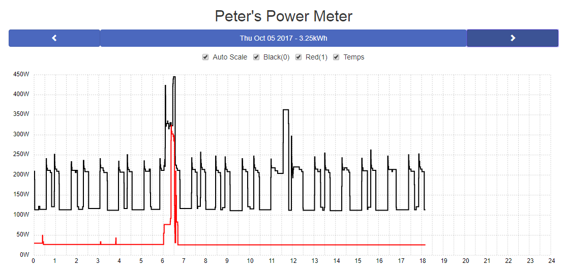 As linhas pretas e vermelhas representam o poder extraído de cada uma das duas fases que entram em casa. Os botões de seta esquerda e direita no topo irão para o dia anterior ou no dia seguinte. Se você estiver no dia de hoje, novos dados serão buscados. Não há necessidade de acertar 'Refresh'!