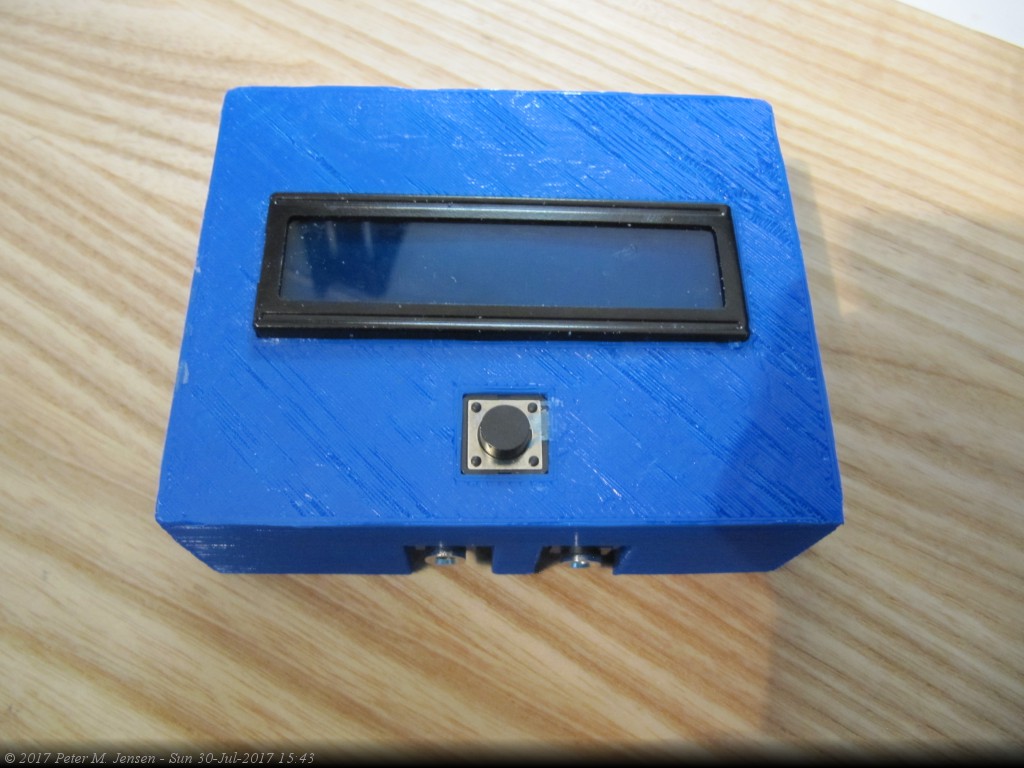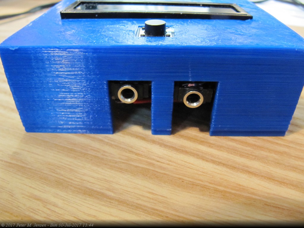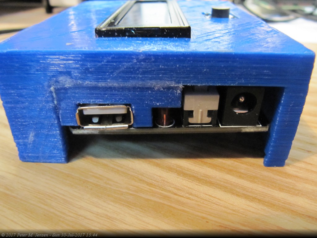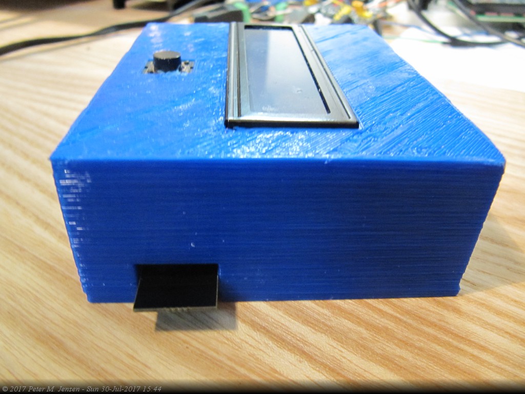 Eu usei o OpenSCAD para projetar uma caixa. O arquivo .scad e os arquivos .stl renderizados estão neste repositório. A caixa com os recortes para a tela, o botão e vários conectores se parecem com o seguinte: