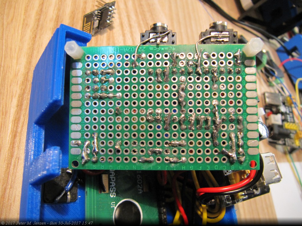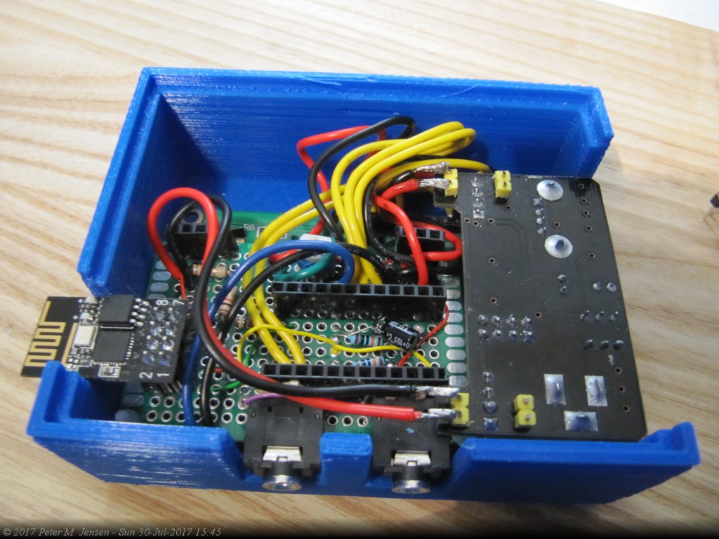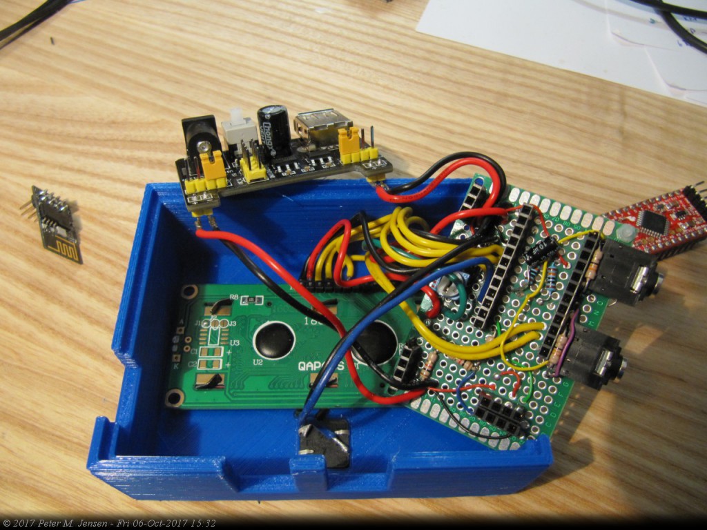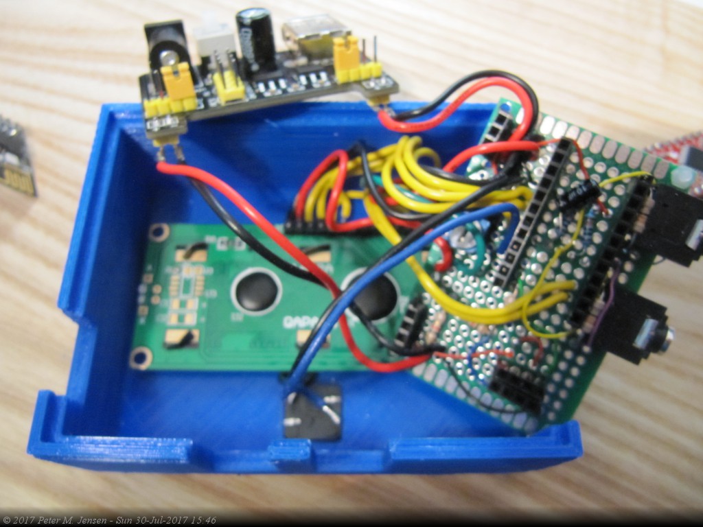 Eu usei o OpenSCAD para projetar uma caixa. O arquivo .scad e os arquivos .stl renderizados estão neste repositório. A caixa com os recortes para a tela, o botão e vários conectores se parecem com o seguinte: