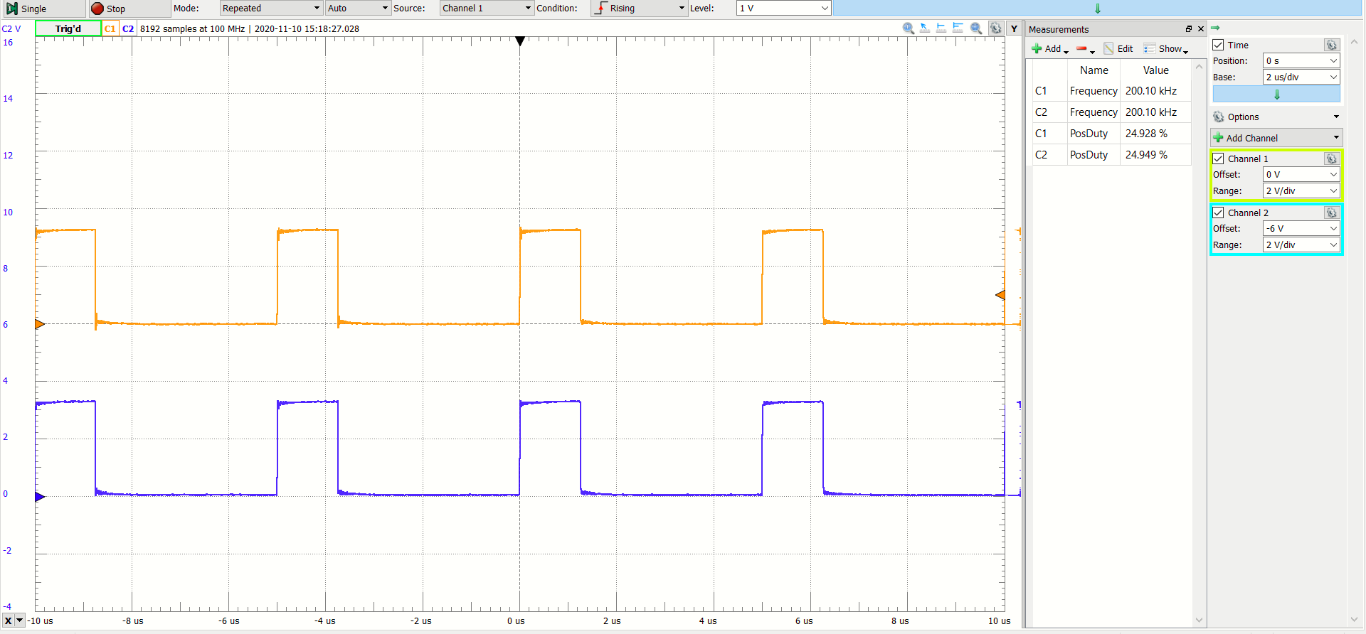 Depois que o dispositivo foi programado e o MCU é iniciado, o PWM Generator #3 está gerando formas de onda PWM de 25% independentes de 200 kHz nas saídas PWM3H/PWM3L.