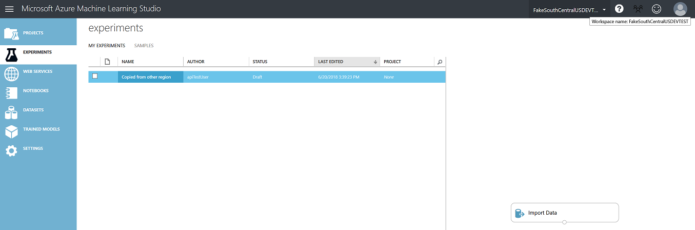 studioClient . ImportExperiment ( destinationWorkspace , inputFilePath , "Copied from other region" ) ;