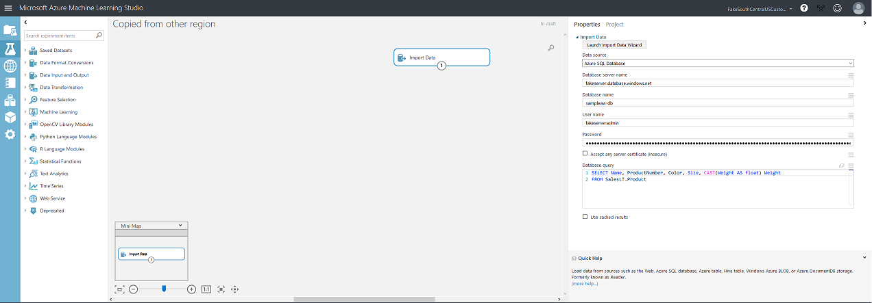 studioClient . ModifyNodeParameter ( workspace , experimentId , "Import Data Comment" , "Database Query" , "SELECT Name, Color, CAST(Weight AS float) Weight r n FROM SalesLT.Product" , "Import Data - Experiment 2" ) ;