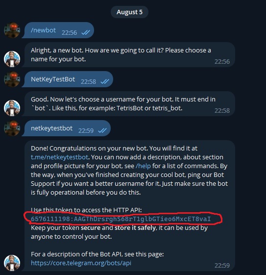 - Перейдите в бот @botfather и создайте своего собственного бота. Вам нужно сохранить токен и имя бота.