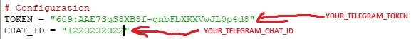 - Вставьте свой токен от бота и своего Chatid, который вы получили ранее.