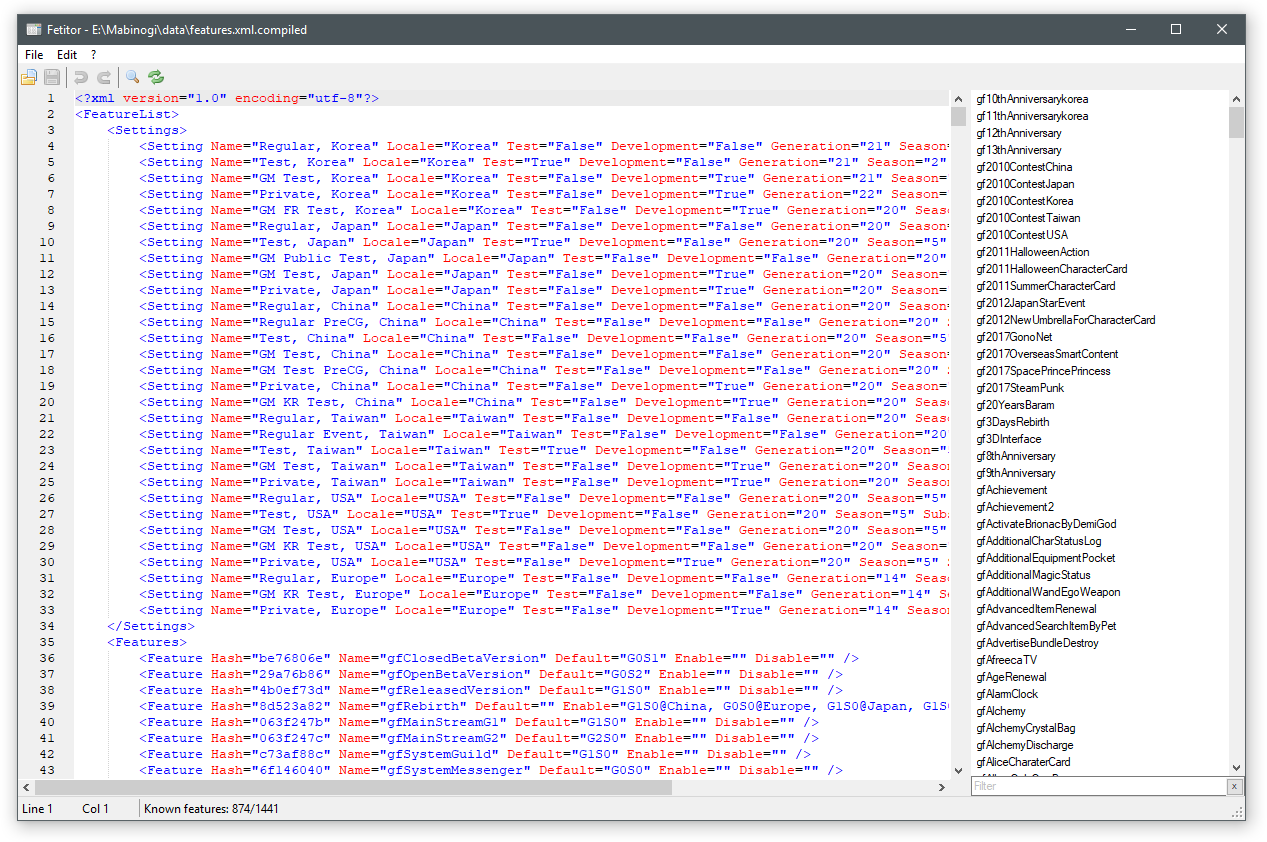 Fetitor является редактором файла функций Mabinogi (features.xml.compiled), который по сути представляет собой скомпилированный XML -файл. Он преобразует его в XML и обратно на лету, чтобы позволить пользователю редактировать его быстрее, чем если бы ему пришлось сначала конвертировать, открыть и редактировать, и преобразовать обратно.