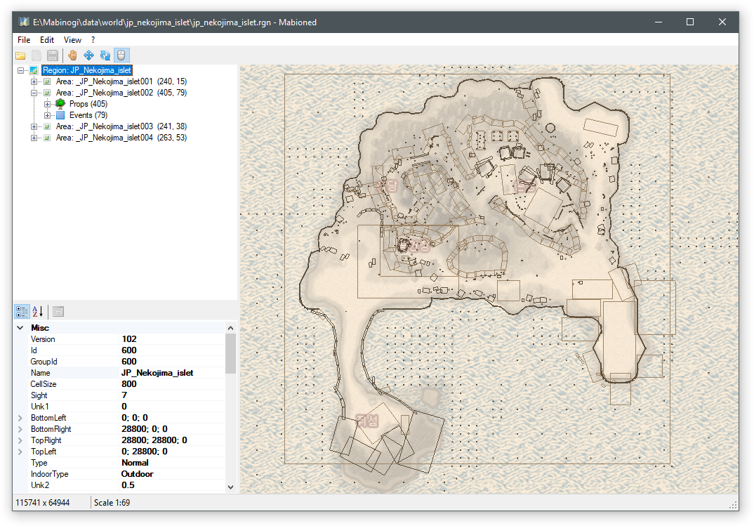 Mabioned является редактором форматов файлов региона Mabinogi (.rgn) и области (.area). Это позволяет изменить любую часть файлов в чистом интерфейсе, одновременно предоставляя некоторые функции качества жизни, такие как перемещение и вращающиеся объекты с мышью на карте.
