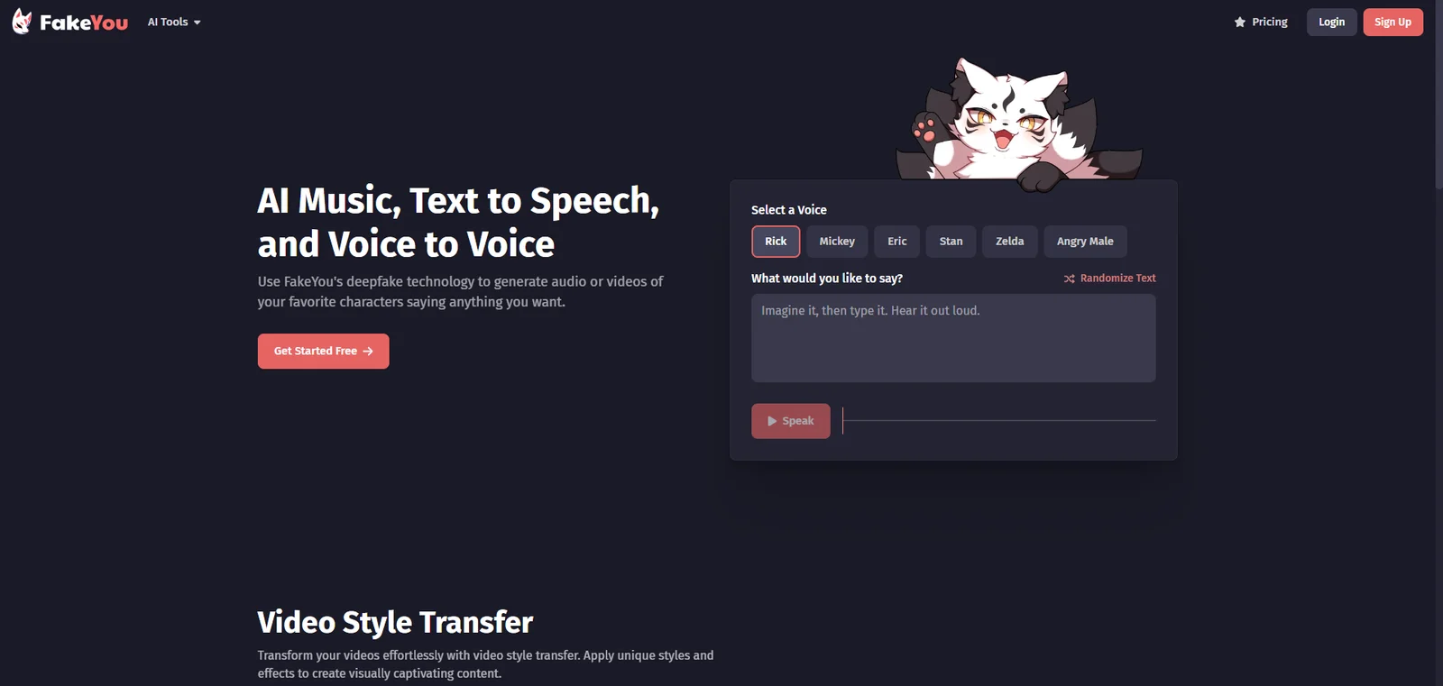 FakeYou เป็นเครื่องมือแปลงข้อความเป็นคำพูดออนไลน์ที่ใช้ปัญญาประดิษฐ์ เหมาะอย่างยิ่งสำหรับการสร้างเนื้อหาและความบันเทิงแบบสองมิติ หรือคุณสามารถสร้างเสียงส่วนตัวได้ เช่น การโคลนเสียงของคุณเอง