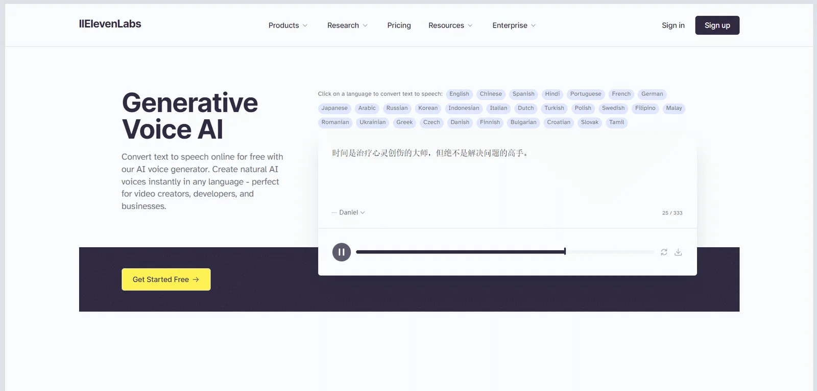 ElevenLabs เป็นเครื่องมือแปลงข้อความเป็นคำพูด AI ขั้นสูงที่ใช้เทคโนโลยีปัญญาประดิษฐ์หลายภาษาที่ล้ำสมัย ซึ่งช่วยให้ผู้ใช้แปลงข้อความที่น่าเบื่อให้เป็นเสียงที่สดใส เป็นธรรมชาติ และราบรื่น โดยรองรับการจดจำและการแปลงอัจฉริยะใน 29 ภาษา และได้สร้าง- มีไลบรารีเนื้อหาเสียงที่หลากหลาย ครอบคลุมสไตล์ อายุ และเพศที่หลากหลาย ใช้งานง่าย เพียงป้อนข้อความแล้วคลิกเพื่อสร้างเสียงพากย์คุณภาพสูงในไม่กี่วินาที