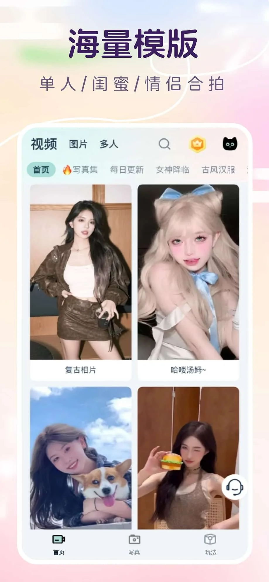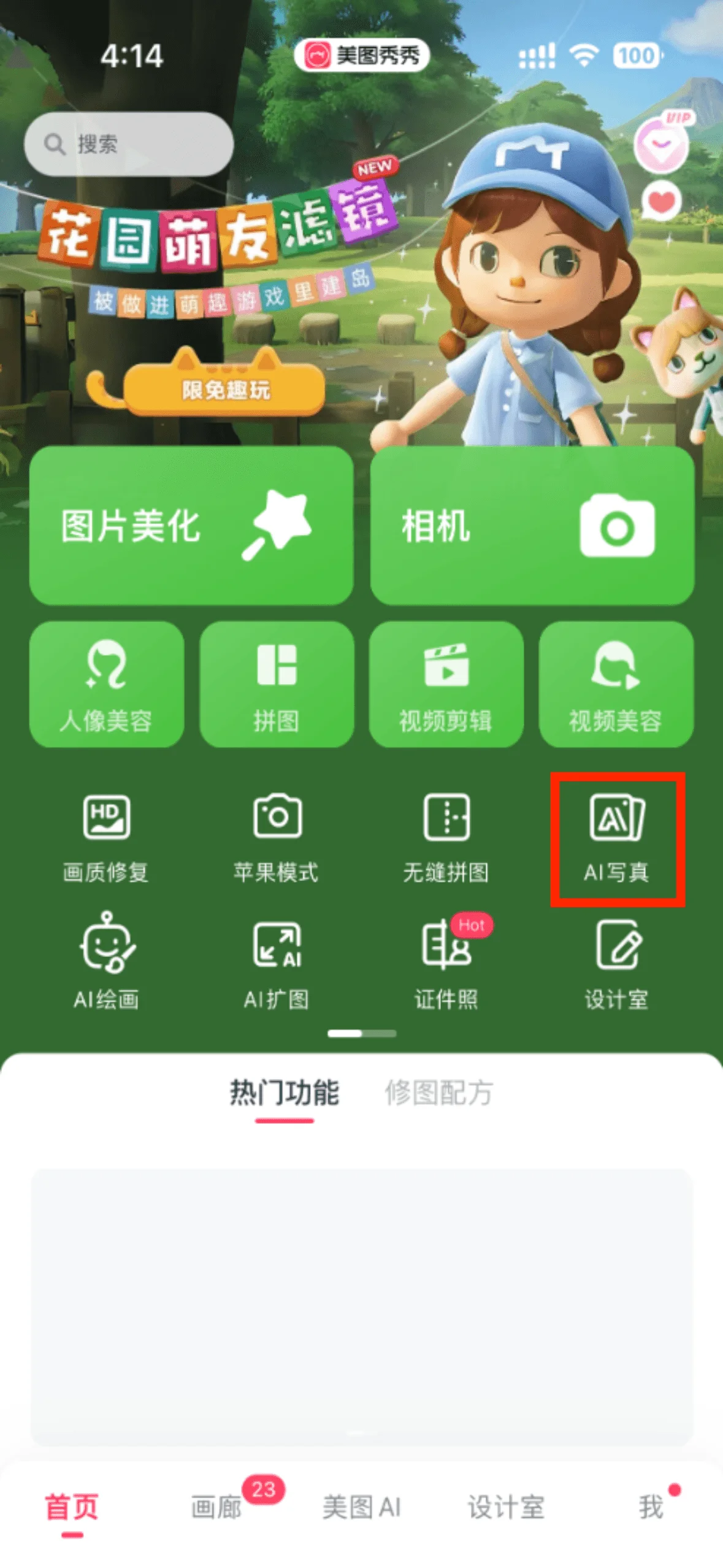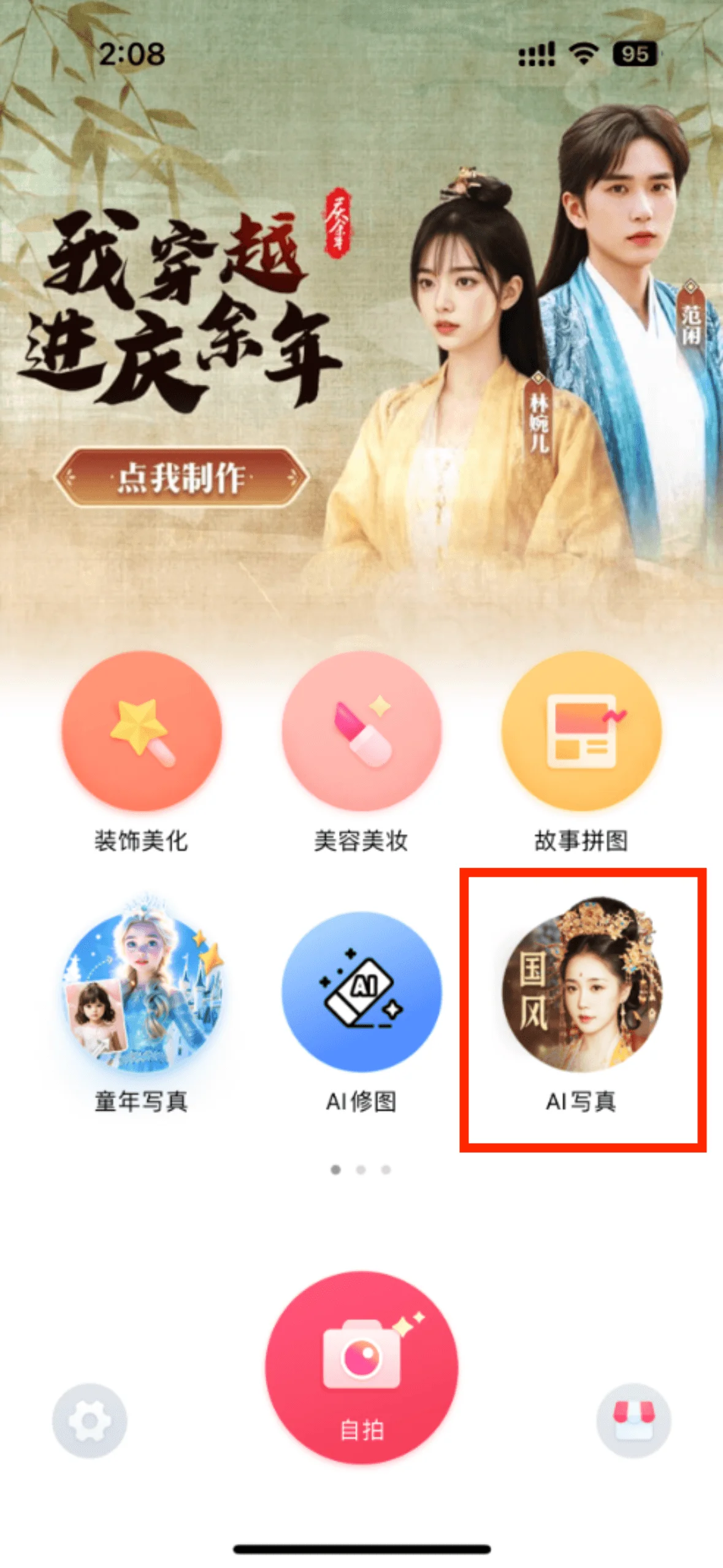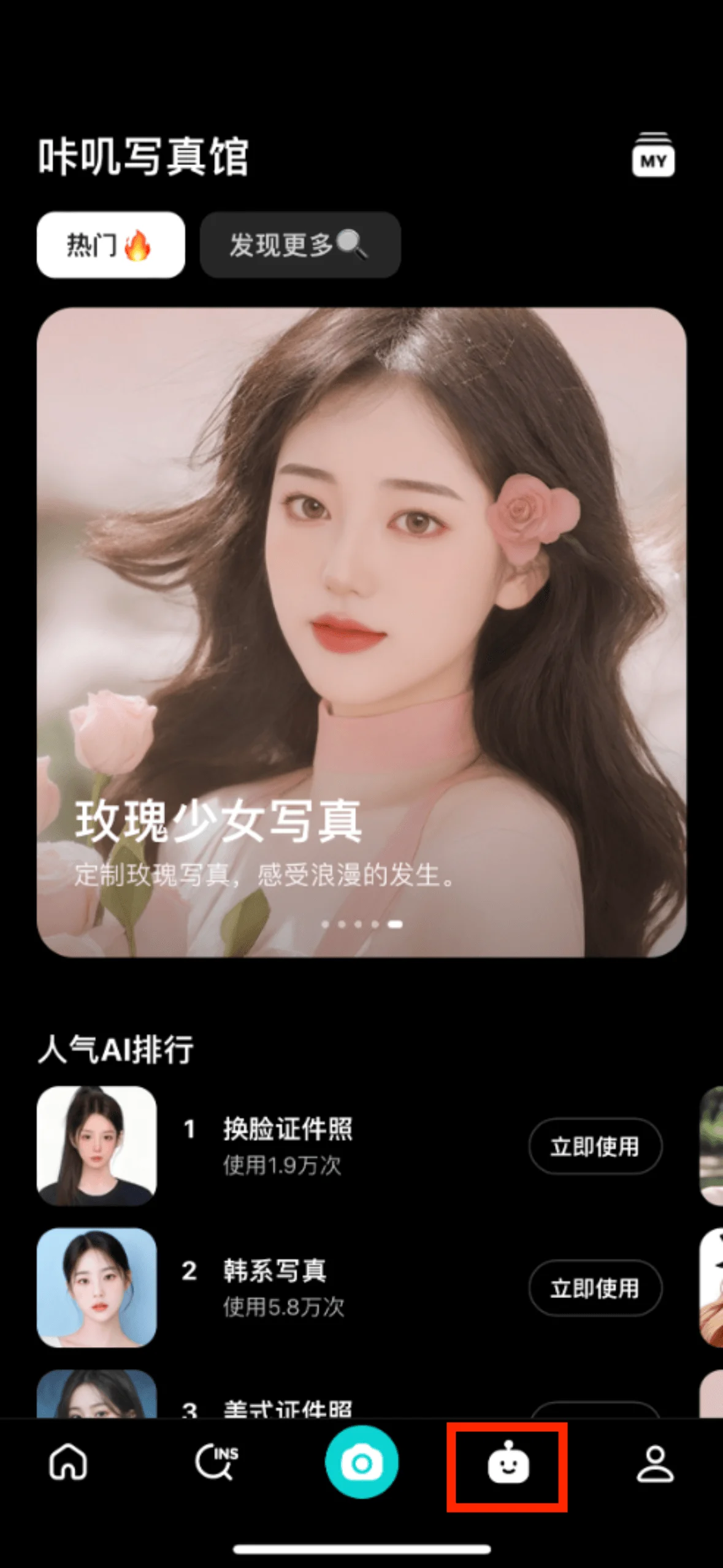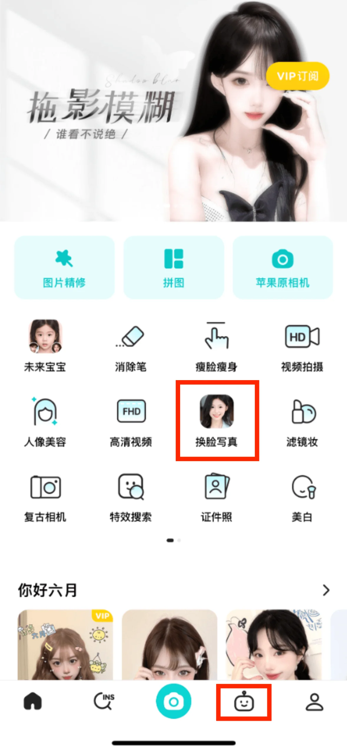 ผู้ใช้สามารถค้นหาฟังก์ชั่นภาพถ่ายเปลี่ยนใบหน้า (ภาพถ่าย AI) ได้ตรงกลางหน้าแรกของ APP และทางด้านขวาของแถบฟังก์ชั่นด้านล่าง