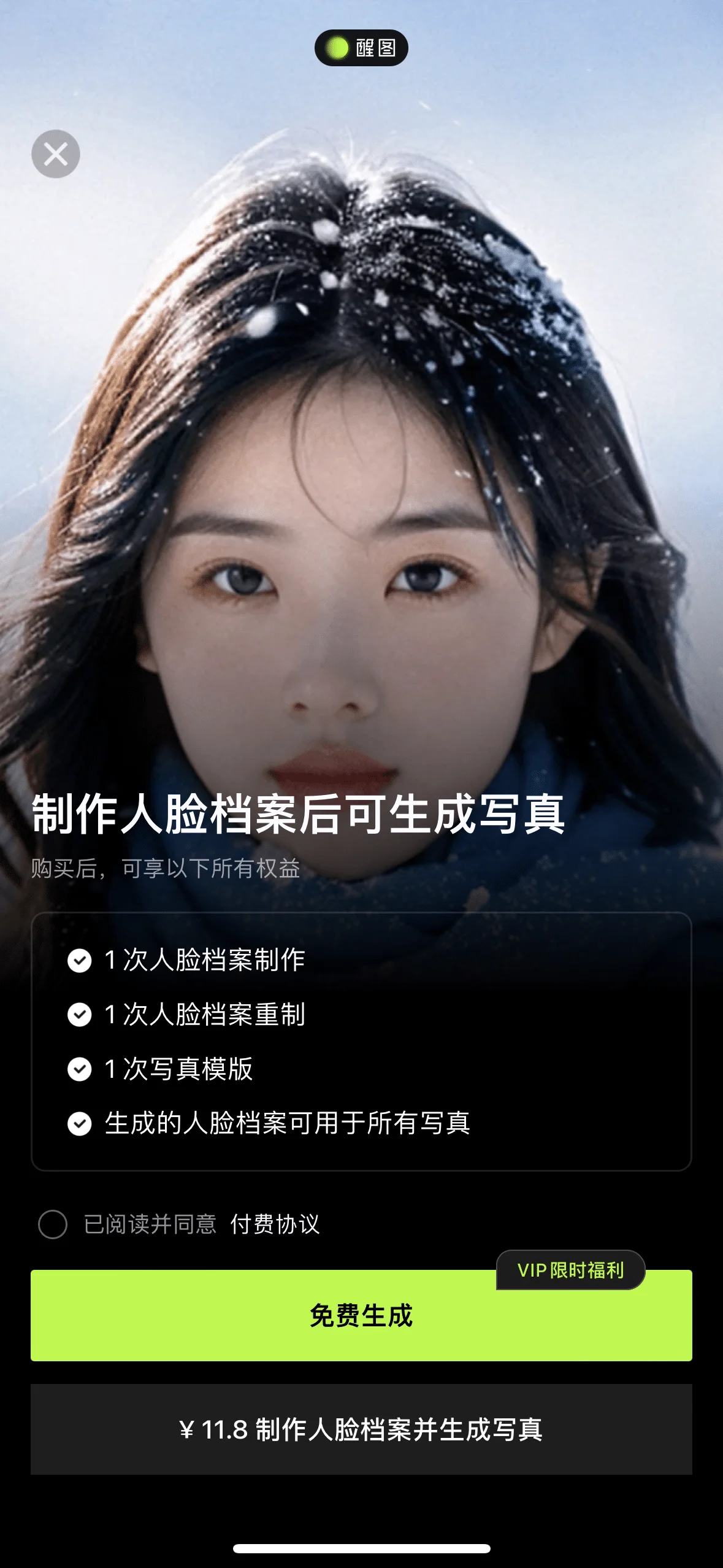 ฟังก์ชั่นการถ่ายภาพ AI ของ Xingtu ต้องเป็นสมาชิก VIP ก่อนจึงจะสามารถใช้งานได้ ผู้ใช้จะต้องลงทะเบียนเป็นสมาชิก VIP จากพอร์ทัลภาพถ่าย AI เพื่อรับการสร้างภาพถ่าย 1 ภาพและการสร้างโปรไฟล์ใบหน้า 1 ครั้งฟรี การใช้งานครั้งต่อไปต้องซื้อเพิ่มเติม ราคาประมาณ 11.8 หยวน
