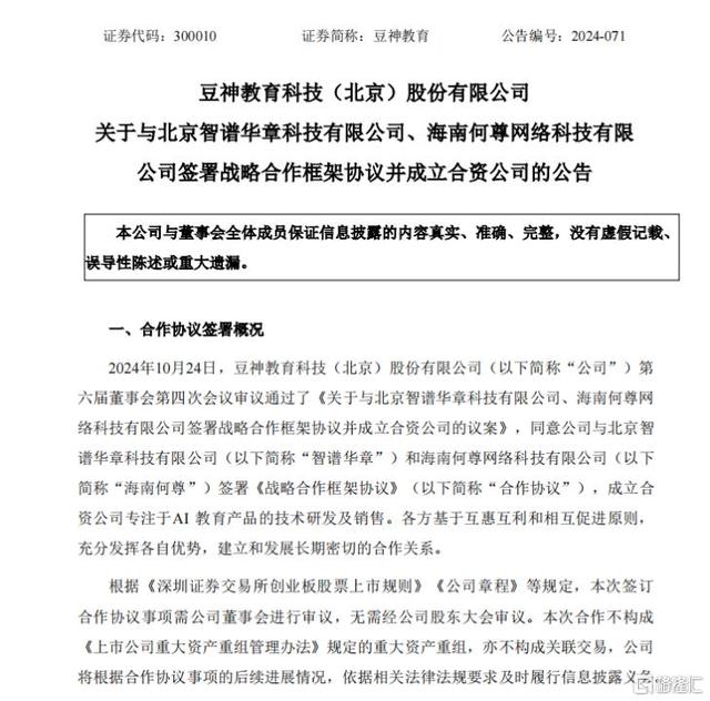เมื่อวันที่ 24 ตุลาคม Doushen Education ประกาศว่าบริษัทจะจัดตั้งบริษัทร่วมทุนกับ Zhipu Huazhang (ต่อไปนี้จะเรียก ว่า Zhipu ) เพื่อมุ่งเน้นการวิจัยและพัฒนาเทคโนโลยี และจำหน่ายผลิตภัณฑ์ด้านการศึกษา AI ในภายหลังในวันที่ 26 ตุลาคม "Beijing Education Field" คู่มือการประยุกต์ใช้ปัญญาประดิษฐ์ (2024)" ได้รับการเผยแพร่ โดยชี้แจงข้อกำหนดการประยุกต์ใช้ปัญญาประดิษฐ์ในด้านการศึกษา และให้คำแนะนำโรงเรียน ครู และนักเรียนในการดำเนินการประยุกต์ในลักษณะที่ปลอดภัยและเป็นระเบียบ