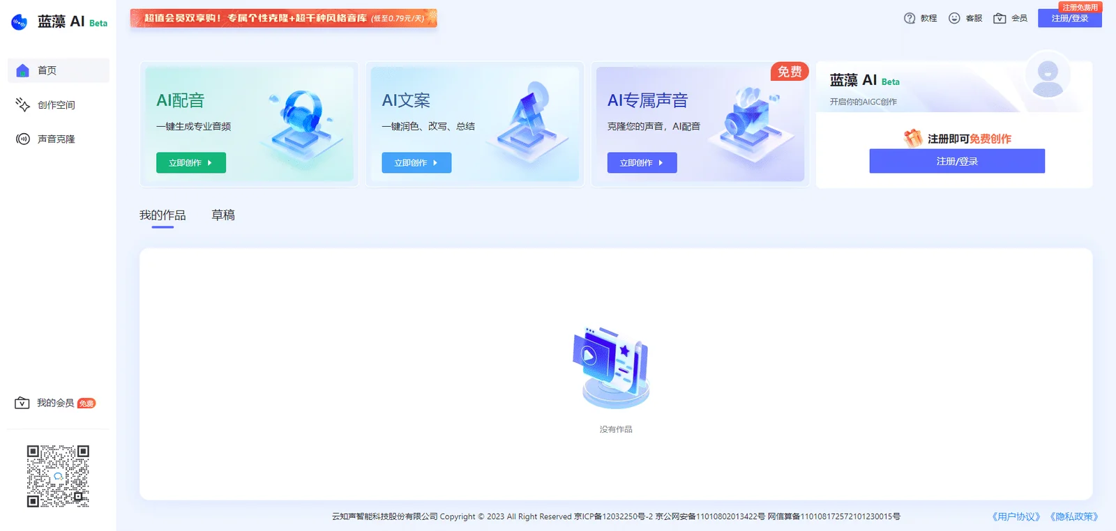 Blue Algae ให้ ทดลองใช้งานฟรี หลังการลงทะเบียนและเข้าสู่ระบบ และคุณสามารถทดลองใช้ฟังก์ชันต่างๆ เช่น การโคลนนิ่งอย่างรวดเร็ว การสร้างการเขียนคำโฆษณา และการออดิชั่นพากย์เสียง หากต้องการใช้ฟังก์ชันและสิทธิประโยชน์ครบถ้วน คุณต้องสมัครสมาชิก