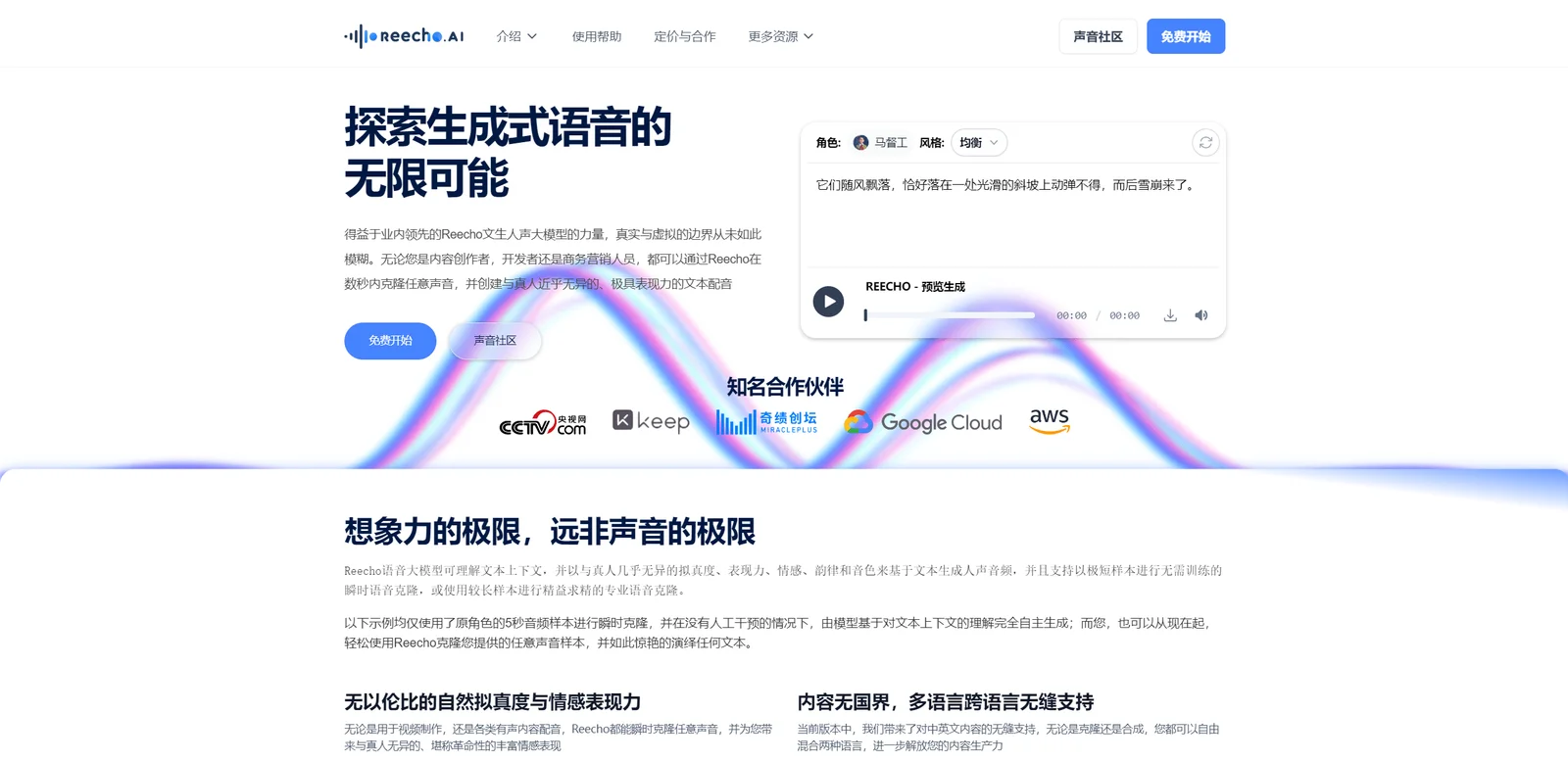 Reecho เป็นแพลตฟอร์มสำหรับการโคลนเสียงและการพากย์เสียงแบบทันทีทันใด โดยอิงจากโมเดลเสียงขนาดใหญ่ของ Wensheng ที่บริษัทพัฒนาขึ้นเอง และได้รับการฝึกอบรมเกี่ยวกับข้อมูลเสียงขนาดใหญ่ล่วงหน้าหลายล้านชั่วโมง โดยสามารถวิเคราะห์ ทำความเข้าใจ และเลียนแบบตัวอย่างได้อย่างรวดเร็ว เพียง 5 ปี เสียงอ้างอิง -8 วินาทีสามารถเลียนแบบและสังเคราะห์ผลลัพธ์เสียงที่เป็นธรรมชาติและแสดงออกได้อย่างดีเยี่ยมด้วยอารมณ์ ลักษณะคำพูด และจังหวะของมนุษย์ในสถานการณ์ส่วนใหญ่