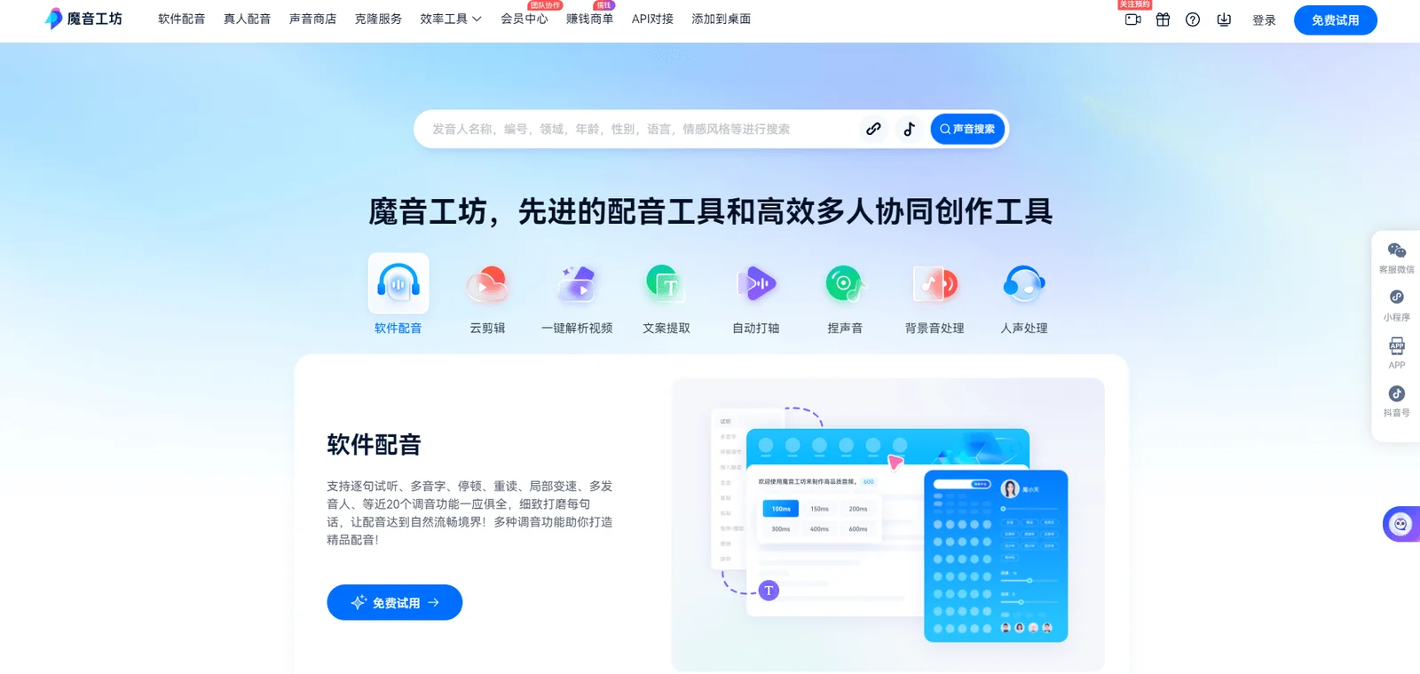 Magic Sound Workshop เป็นเครื่องมือพากย์ระดับมืออาชีพที่ใช้เทคโนโลยีปัญญาประดิษฐ์ซึ่งสนับสนุนการสร้างสรรค์การทำงานร่วมกันแบบออนไลน์แบบหลายคน ไม่เพียงแต่สามารถพากย์เสียงอย่างชาญฉลาดเท่านั้น แต่ยังดำเนินการสร้างการเขียนคำโฆษณาและการตัดต่อวิดีโออีกด้วย