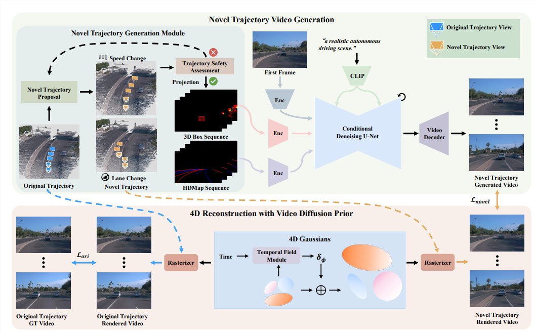 สิ่งที่ยอดเยี่ยมยิ่งกว่านั้นคือ DriveDreamer4D ยังออกแบบโมดูลการสร้างวิถี (NTGM) ใหม่เป็นพิเศษ สิ่งนี้สามารถสร้างวิถีใหม่ๆ ต่างๆ ที่สอดคล้องกับกฎจราจรได้โดยอัตโนมัติ เช่น การเปลี่ยนเลน การเร่งความเร็ว การชะลอความเร็ว เป็นต้น จากนั้นใช้โมเดลโลกเพื่อสร้างวิดีโอในมุมมองที่สอดคล้องกันซึ่งเทียบเท่ากับการจ้าง "คู่หู" สำหรับโมเดลการสร้างฉาก 4 มิติใหม่ ทำให้สามารถรับมือกับสภาพถนนที่ซับซ้อนต่างๆ ได้อย่างง่ายดาย