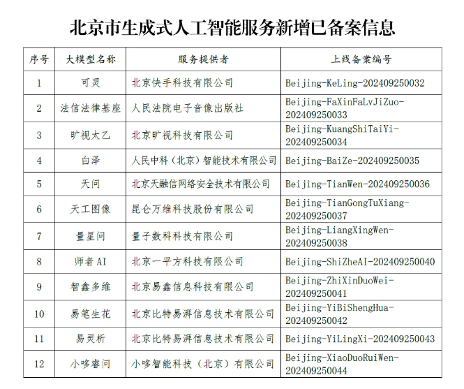 บัญชีสาธารณะปักกิ่งของ Netcom ระบุว่าตาม "มาตรการชั่วคราวสำหรับการจัดการบริการปัญญาประดิษฐ์ทั่วไป" ณ วันที่ 21 ตุลาคม ปักกิ่งได้เพิ่มบริการปัญญาประดิษฐ์เจนเนอเรชั่นใหม่ 12 บริการที่ได้รับการจดทะเบียนแล้ว ขณะนี้ จำนวนบริการปัญญาประดิษฐ์เจนเนอเรชั่นที่จดทะเบียนทั้งหมดมีจำนวนถึง 94 รายการ