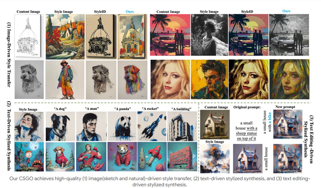 เมื่อเร็วๆ นี้ ทีม InstantX ร่วมกับทีมวิจัยจากมหาวิทยาลัยวิทยาศาสตร์และเทคโนโลยีหนานจิง มหาวิทยาลัยเป่ยหาง และมหาวิทยาลัยปักกิ่ง ร่วมกันพัฒนาโมเดลการถ่ายโอนรูปแบบใหม่ที่เรียกว่า CSGO โดยมีเป้าหมายเพื่อปรับปรุงเทคโนโลยีการสร้างภาพ โดยเฉพาะอย่างยิ่งในการผสมผสานระหว่างเนื้อหาและสไตล์