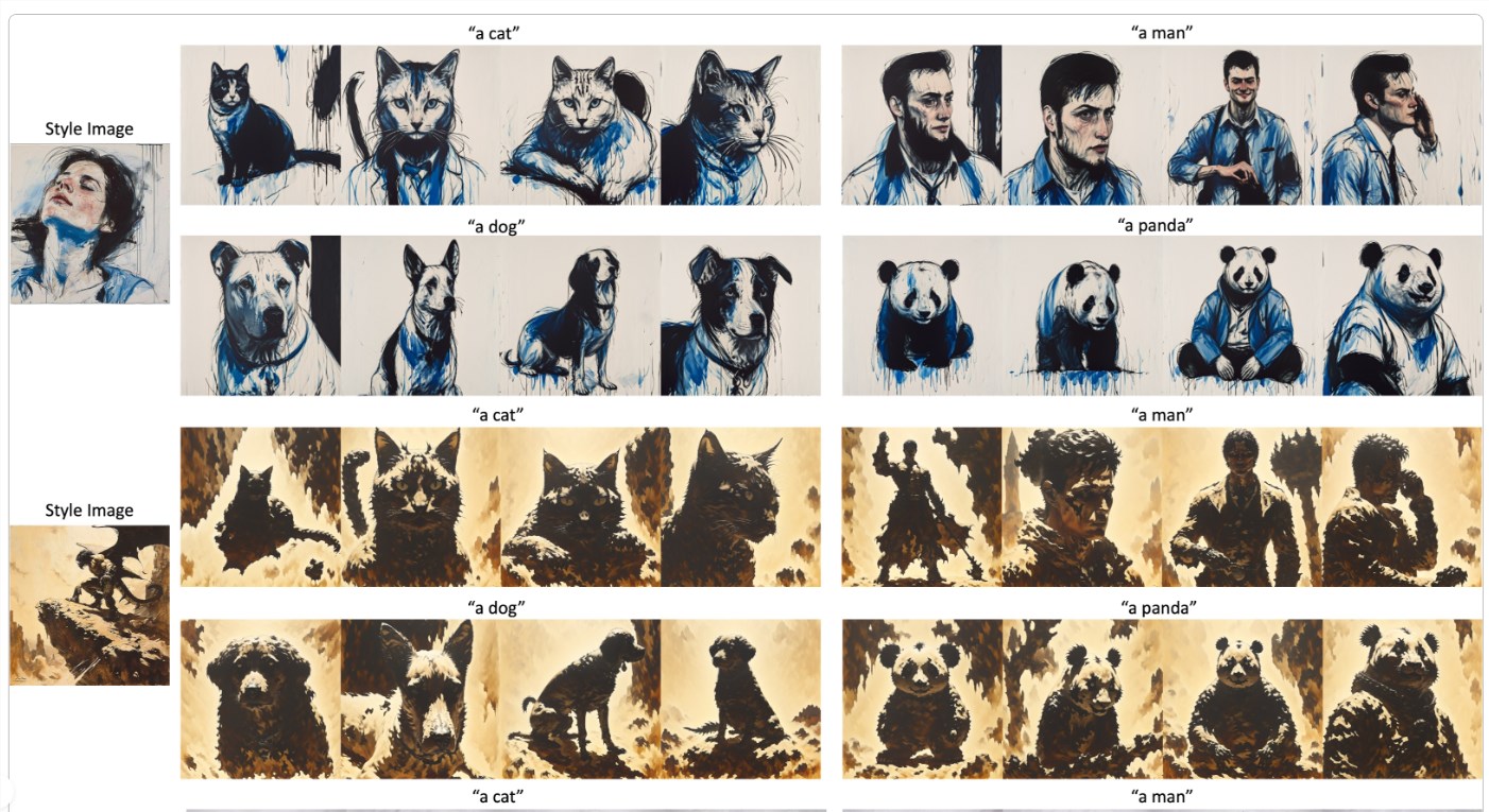 2. รูปภาพอ้างอิงสไตล์ + ข้อความแจ้งให้สังเคราะห์รูปภาพสไตล์พร้อมเนื้อหาข้อความ ตัวอย่างเช่น ในกรณีต่อไปนี้ หากให้รูปภาพสไตล์อ้างอิงและข้อความแจ้งเตือน เช่น "แมว สุนัข ผู้ชาย หมีแพนด้า" ก็จะสามารถสร้างรูปภาพสไตล์เนื้อหาที่สอดคล้องกันได้