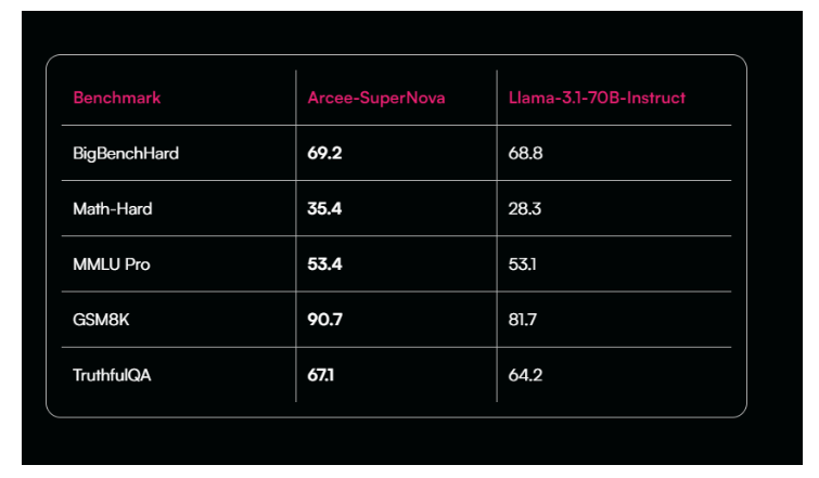 Arcee อ้างว่าสิ่งนี้มีส่วนทำให้ SuperNova มีความสามารถในการปฏิบัติตามคำสั่งของ SuperNova โดยเฉพาะอย่างยิ่งการกลั่นจากโมเดลพาราเมตริก 405B ซึ่งไม่เพียงแต่แสดงให้เห็นว่า SuperNova สามารถจับแก่นแท้ของโมเดลขนาดใหญ่ในขณะที่ยังคงใช้งานฮาร์ดแวร์เพียงเล็กน้อย
