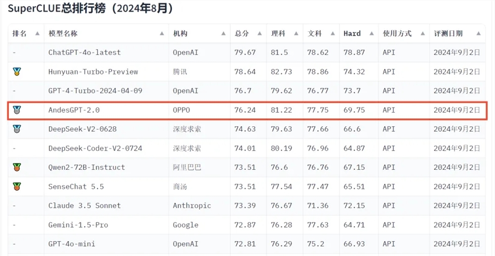 OPPO ประกาศว่าปัญญาประดิษฐ์ขนาดใหญ่รุ่น AndesGPT-2.0 มีประสิทธิภาพโดดเด่นใน "รายงานการประเมินเกณฑ์มาตรฐานโมเดลขนาดใหญ่ของจีนในเดือนสิงหาคม 2567" ซึ่งเผยแพร่โดยหน่วยงานประเมินบุคคลที่สามที่เชื่อถือได้ SuperCLUE ซึ่งได้รับรางวัลหลายรายการ ถือเป็นเทคโนโลยีของ OPPO ในด้าน AI ความแข็งแกร่งได้รับการยอมรับจากอุตสาหกรรมต่อไป