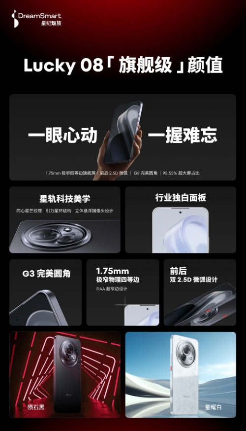 การออกแบบรูปลักษณ์ของโทรศัพท์มือถือ Meizu Lucky08 ใช้แนวคิดการออกแบบใหม่ที่เป็นเอกลักษณ์ของสุนทรียศาสตร์ของเทคโนโลยี Star Track ซีรีส์นี้ โทรศัพท์มือถือมาพร้อมกับหน้าจอเรือธงสี่สี่เหลี่ยมแคบพิเศษ 1.75 มม. การออกแบบไมโครอาร์ค 2.5D ที่ด้านหน้าและด้านหลัง และมุมโค้งมนที่สมบูรณ์แบบของ G3 พร้อมอัตราส่วนหน้าจอต่อตัวเครื่องสูงถึง 93.55% .