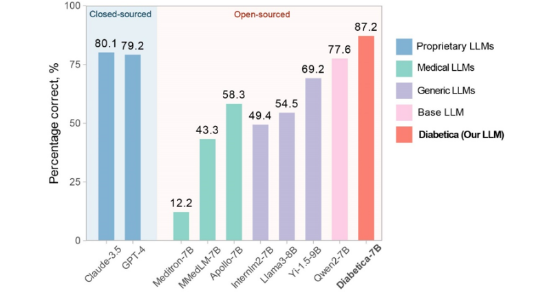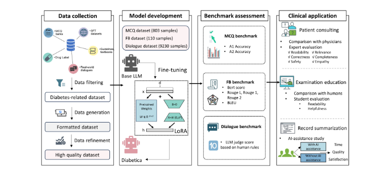 ทีมงานนำกรอบการทำงานใหม่ สร้างระบบประมวลผลข้อมูลที่ครอบคลุม สร้างชุดข้อมูลคุณภาพสูงและเกณฑ์มาตรฐานการประเมิน ปรับแต่งโมเดลภาษาขนาดใหญ่ และปรับปรุงความสามารถในการประมวลผลในงานที่เกี่ยวข้องกับโรคเบาหวานอย่างมีนัยสำคัญ การศึกษาทางคลินิกแสดงให้เห็นว่า Diabetica มีประโยชน์ในการดูแลรักษาโรคเบาหวาน รวมถึงการให้ยาเฉพาะบุคคล การให้ความรู้ทางการแพทย์ และลดความซับซ้อนของงานทางคลินิก