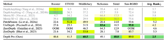 ** การประมาณความลึกที่มีประสิทธิภาพ **: Depth Pro สามารถสร้างแผนที่ความลึก 3 มิติที่มีความละเอียดสูงได้ภายใน 0.3 วินาที ซึ่งเร็วมาก