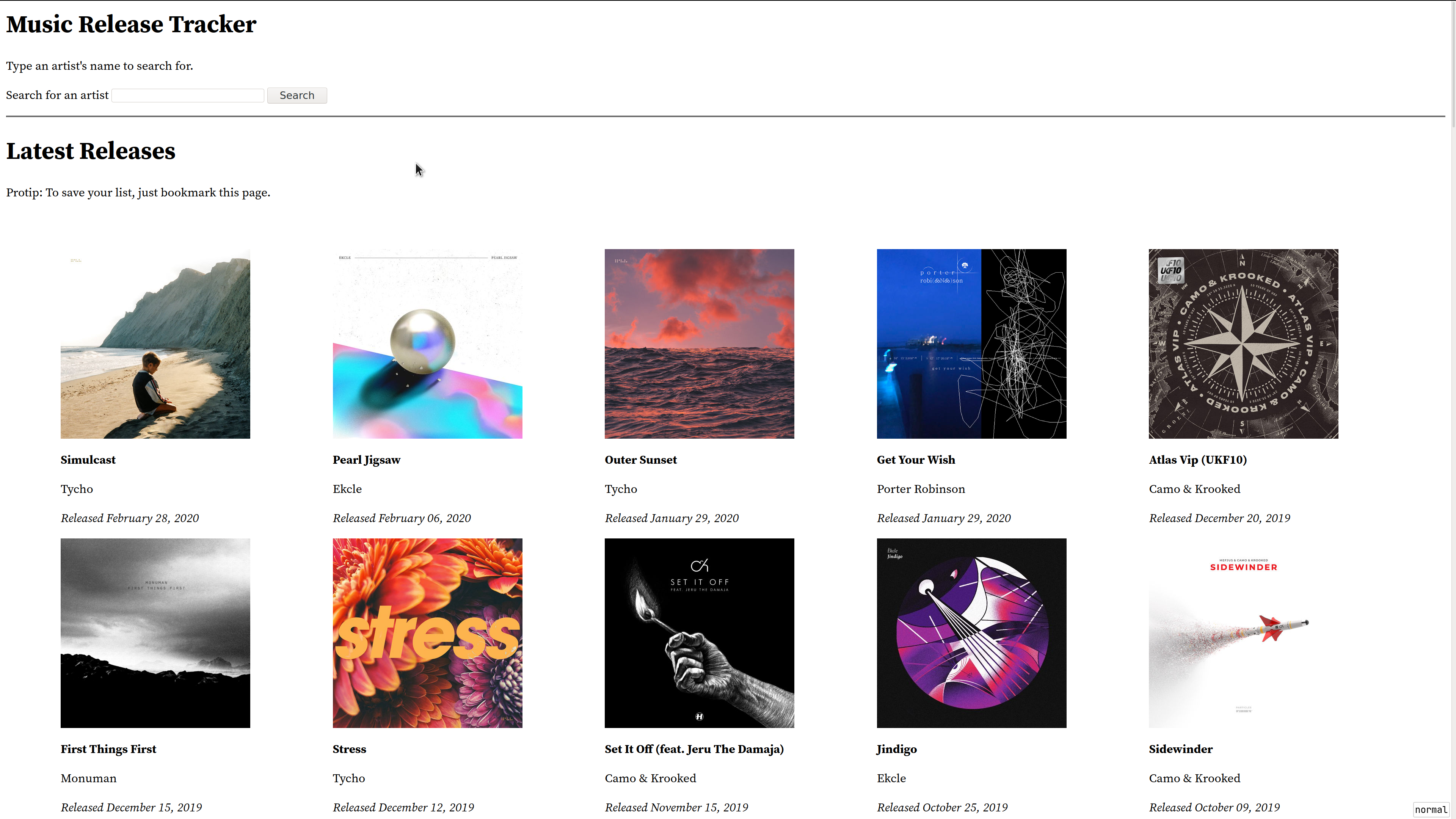 这是一个使用Deezer API的小网络应用程序,以按时间顺序列出一组给定的音乐艺术家发行。当您最喜欢的艺术家发行新音乐时,您可以及时保持最新状态。