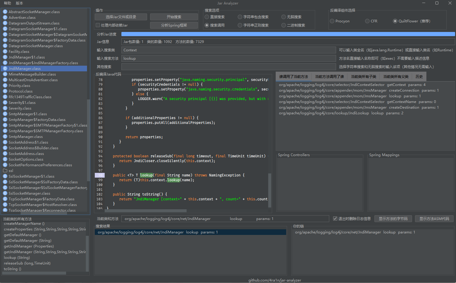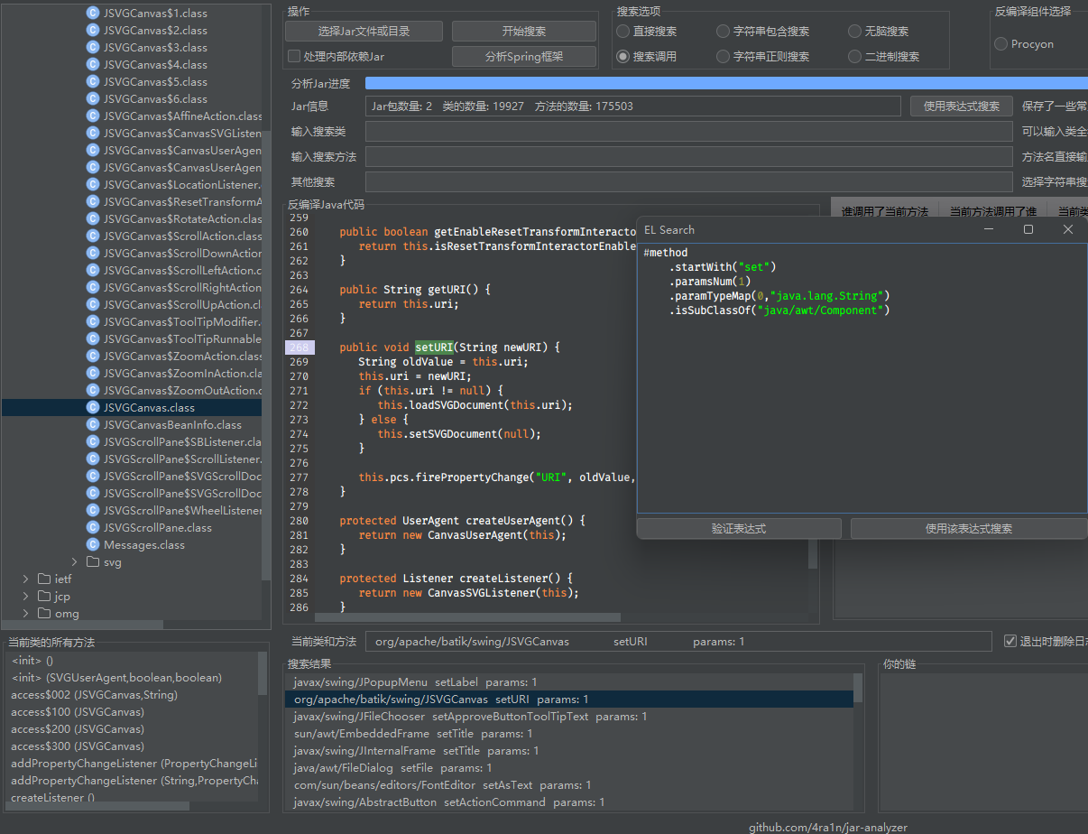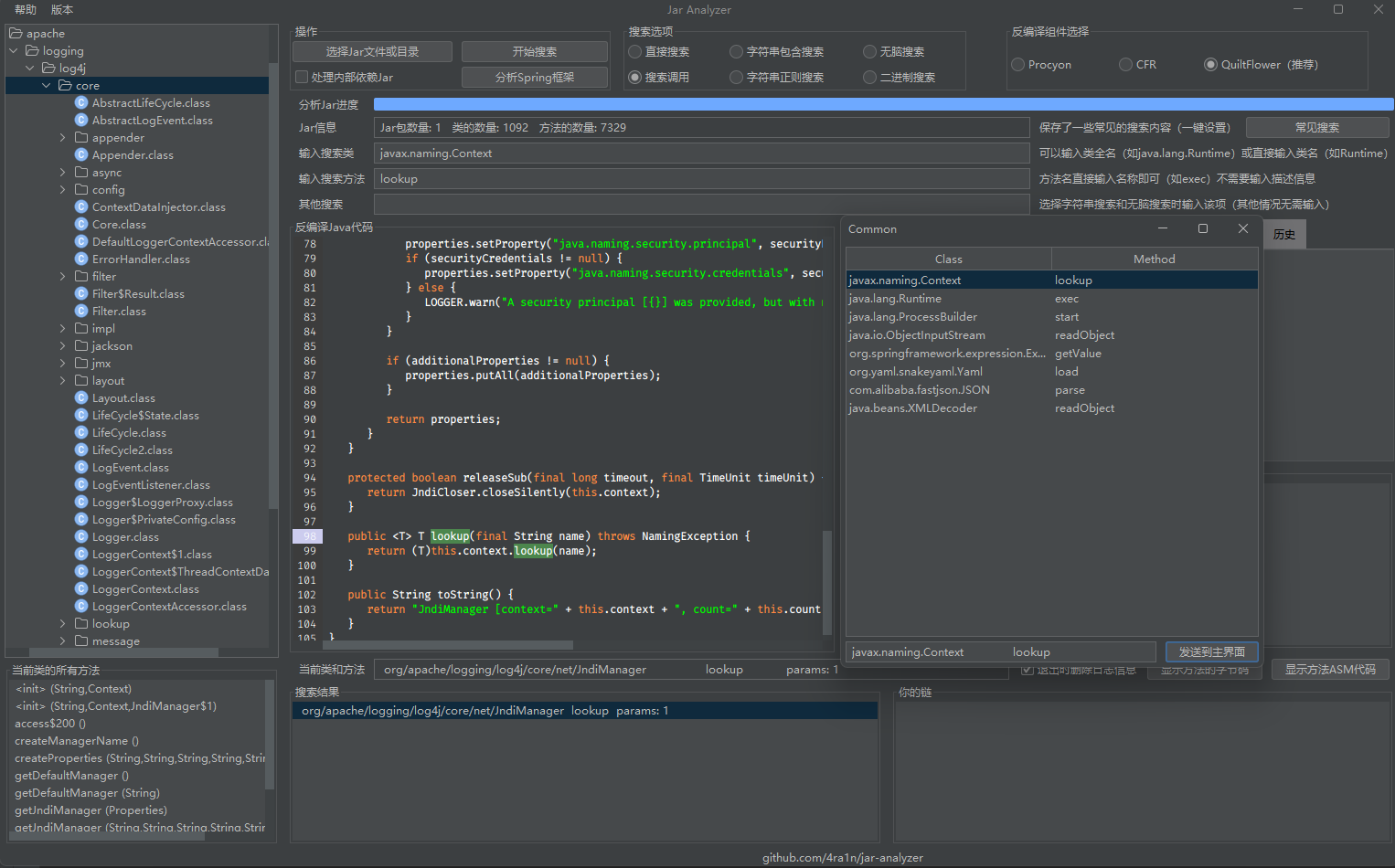 一个用于分析jar包的GUI工具,尤其适合从事代码安全审计。可以在同时分析多个jar文件,可以轻易地搜索目标方法。