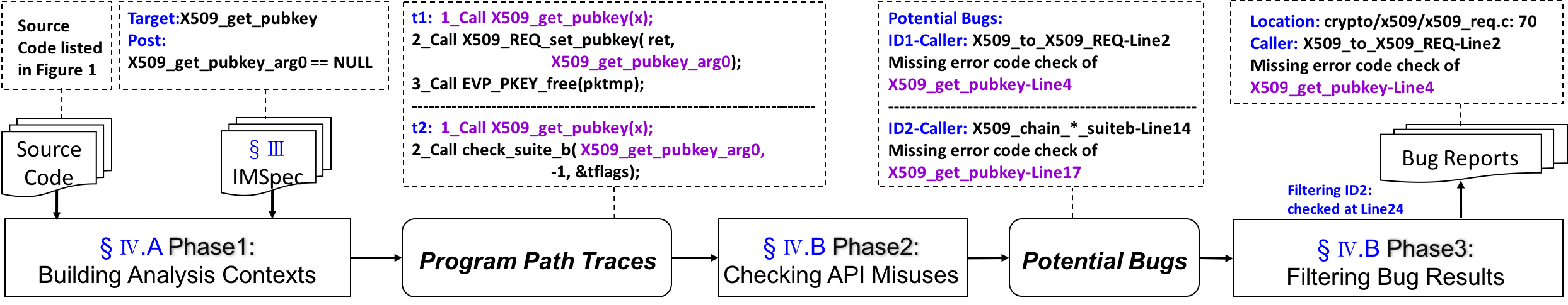 正确的API-USAGE必须满足一组用法约束,即违反约束可能会导致API-MISUSE错误。 Imchecker使用IMSPEC的规格自动在源代码中自动检测这些错误。要处理复杂的现实计划,Imchecker的基本机制必须可扩展,同时牺牲最低限度的准确性。我们详细介绍了Imchecker的设计细节,包括使用静态分析技术来构建分析上下文,在分析上下文中检测API-MISUSE错误的方法,以及使用语义信息和用法统计信息过滤误报的方法。
