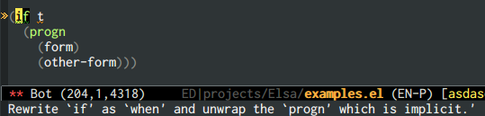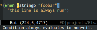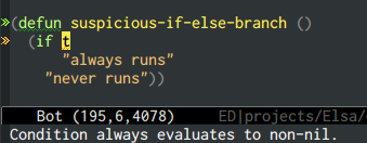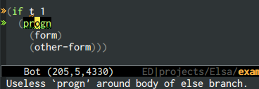 lisp-case代替snake_case 。progn if Else Branch。if不总是对non-nil进行评估的条件(在这种情况下, if形式毫无用处)。ELSA提供了一些内置的规则集,也可以通过加载扩展名来使用更多规则集。