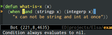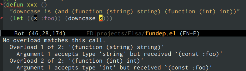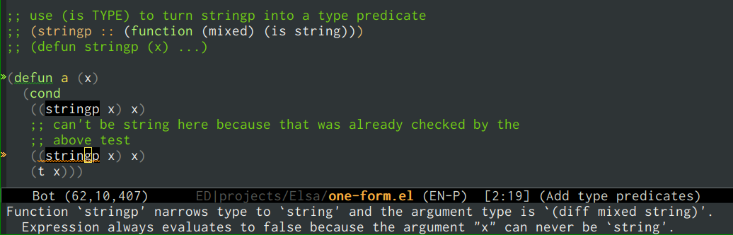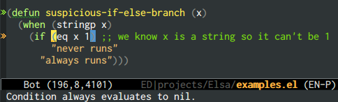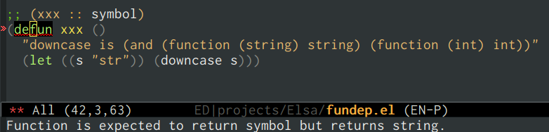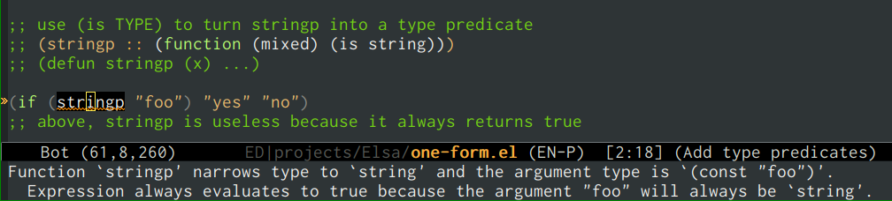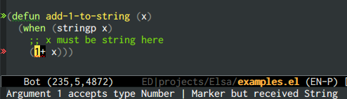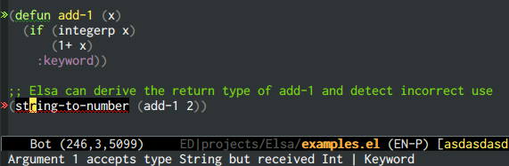 Elsa在Emacs LISP(完全可选)的顶部添加了一个强大的类型系统。在您甚至尝试运行代码之前,当事物不匹配时,可以跟踪类型并提供有用的提示。