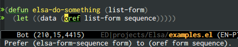 Elsa试图惯用并使用尽可能多的可用信息,例如Edebug声明,Defmethod专业人士或EIEIO类插槽类型,因此需要将需要注释的代码数量最小化。