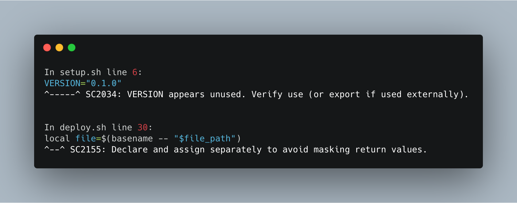 Shell Linter可以以各种方式执行静态分析。默认情况下,它在您的项目中扫描了所有ShellCheck支持的Shell脚本(SH/BASH/DASH/KSH)。但是,您可以使用path参数来扫描特定文件或文件夹,或使用exclude-paths参数将文件或文件夹排除在扫描中。使用Shell Linter,您还可以指定使用severity参数的最小错误严重性。特定用例以及示例如下: