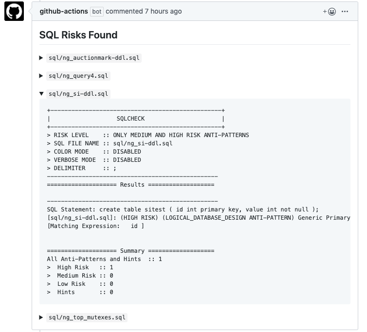 当请求PR时,使用SQLCheck自动识别SQL查询中的反图案的GitHub动作,如果在查询中发现了风险,请在PR时对PR发表评论