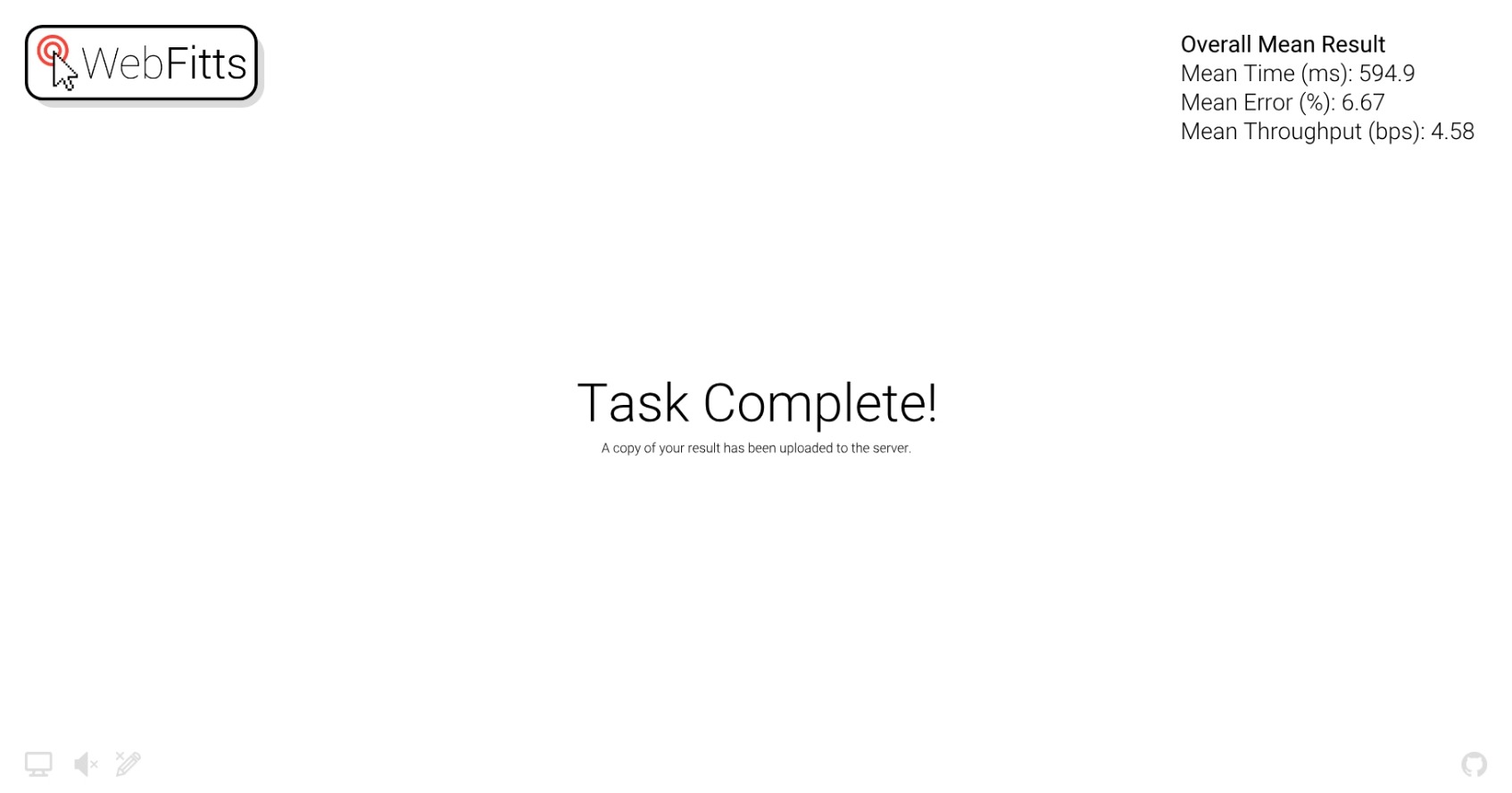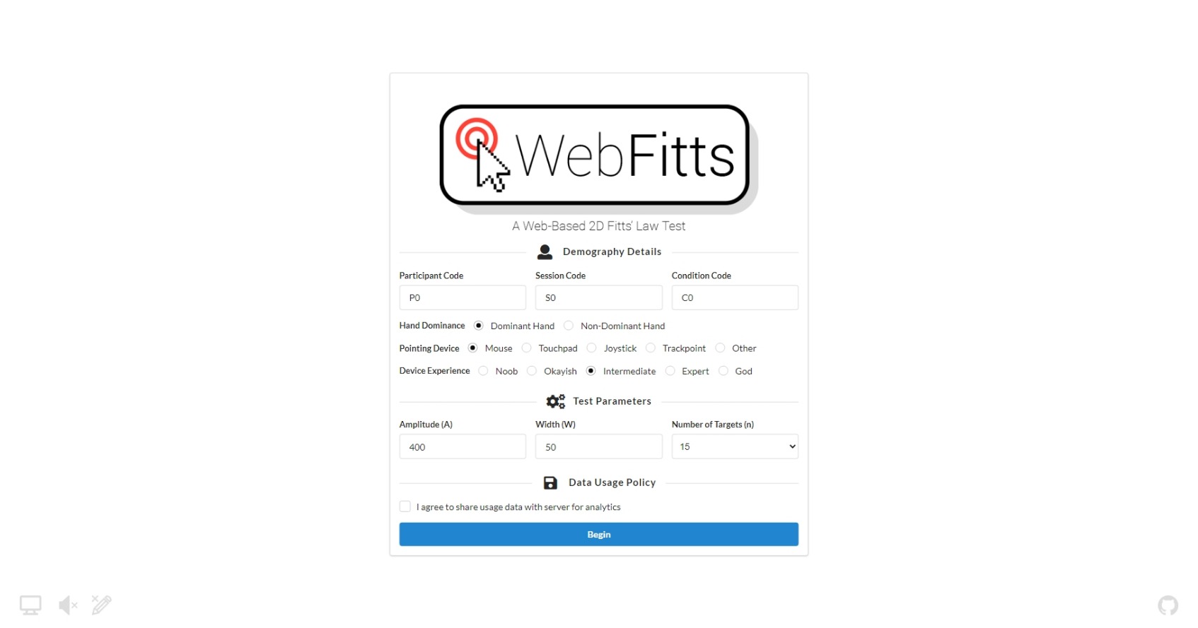 WebFitts是一个基于Web的Fitts的法律测试应用程序,灵感来自Scott Mackenzie的Gofitts应用程序。