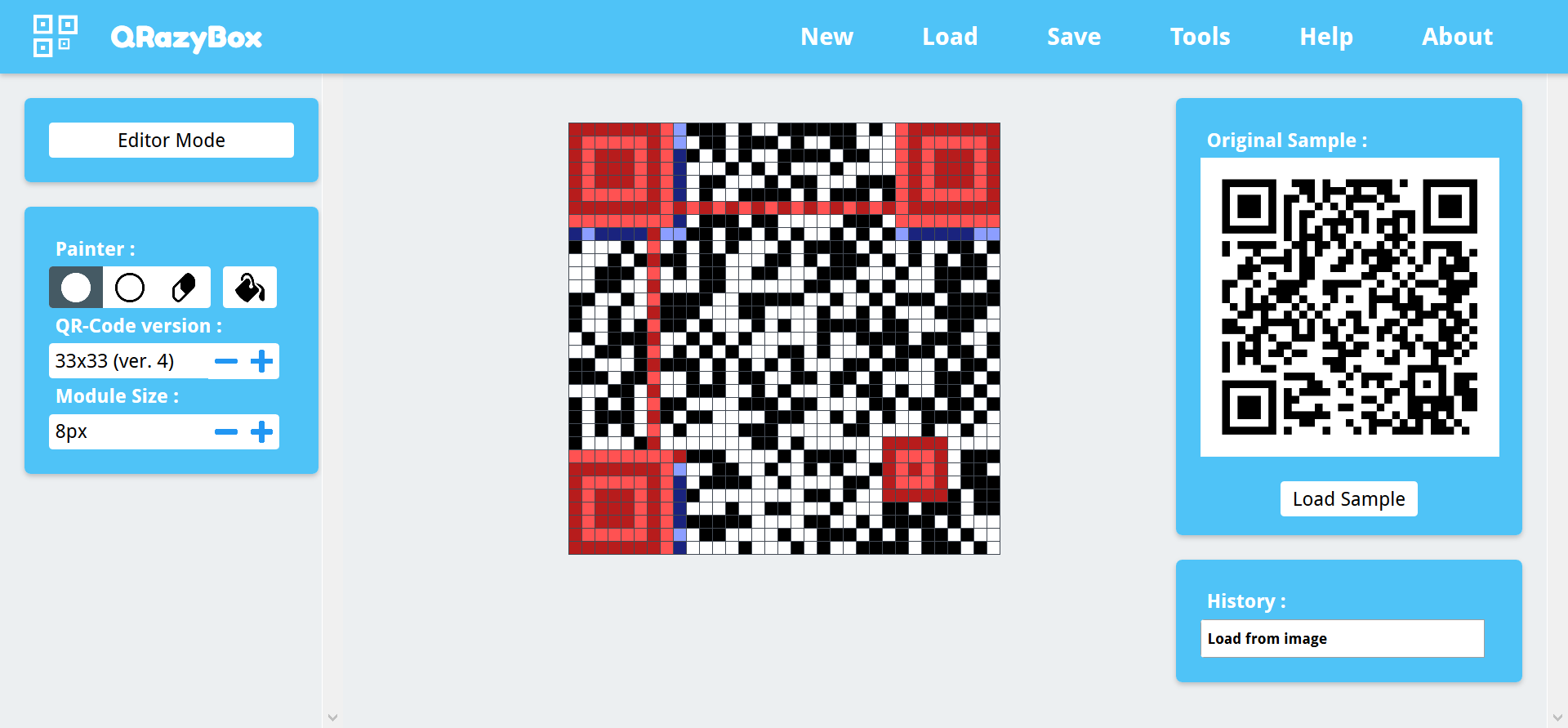Qrazybox可让您通过用类似油漆的编辑器重新绘制和重建QR码来恢复QR码。它还提供了几个子工具,可帮助您更快,更高效地分析和恢复。