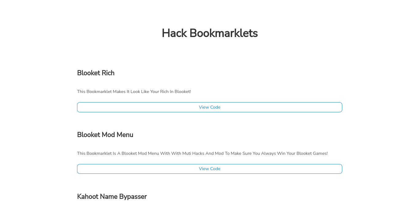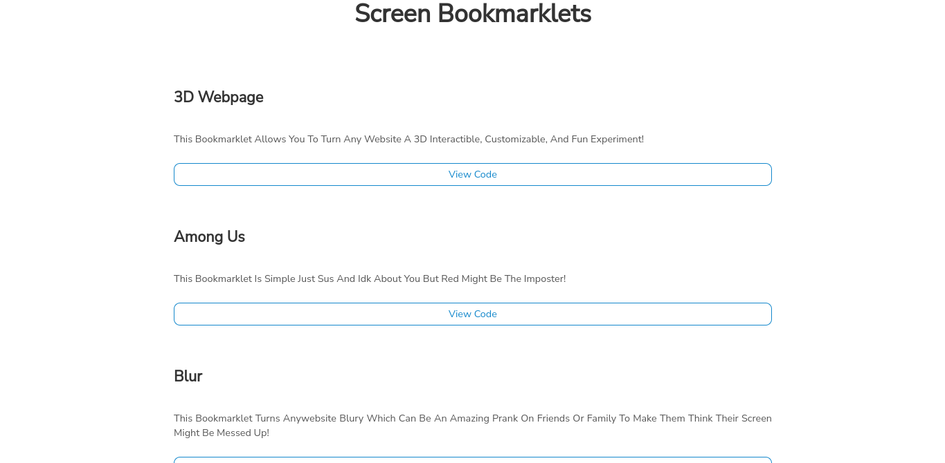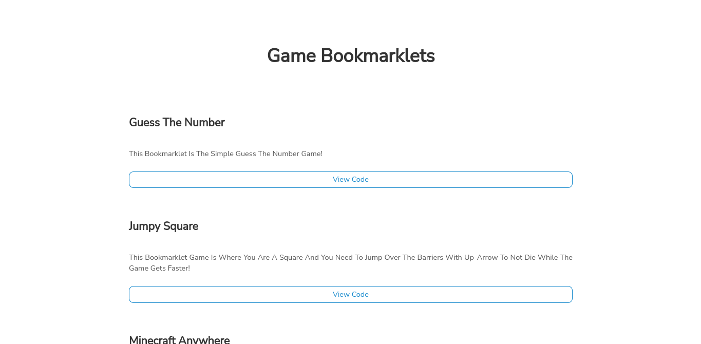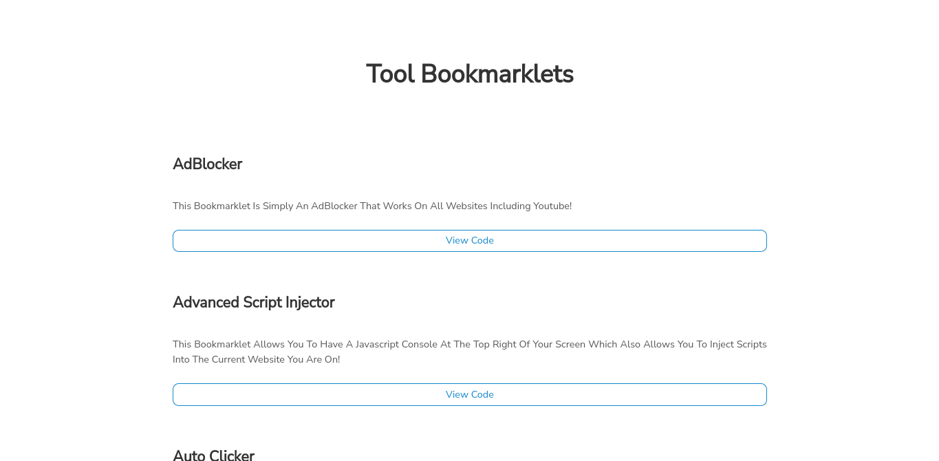 Bookmarklet Catigories ?Github Repo Link ?Replit Source Link ?Over 75 Bookmarklets ?Bookmarklet Discription ?Add A Copy Code Button For Easy Accses To Bookmarklets ?Allow Drop Downs To View The Code ?Make A Search Bar To Find Any Bookmarklet ?Bookmarklet Preview ?? =工作| ? =做| ? =不起作用