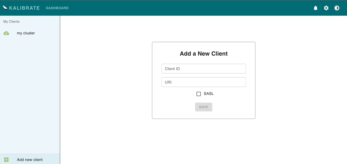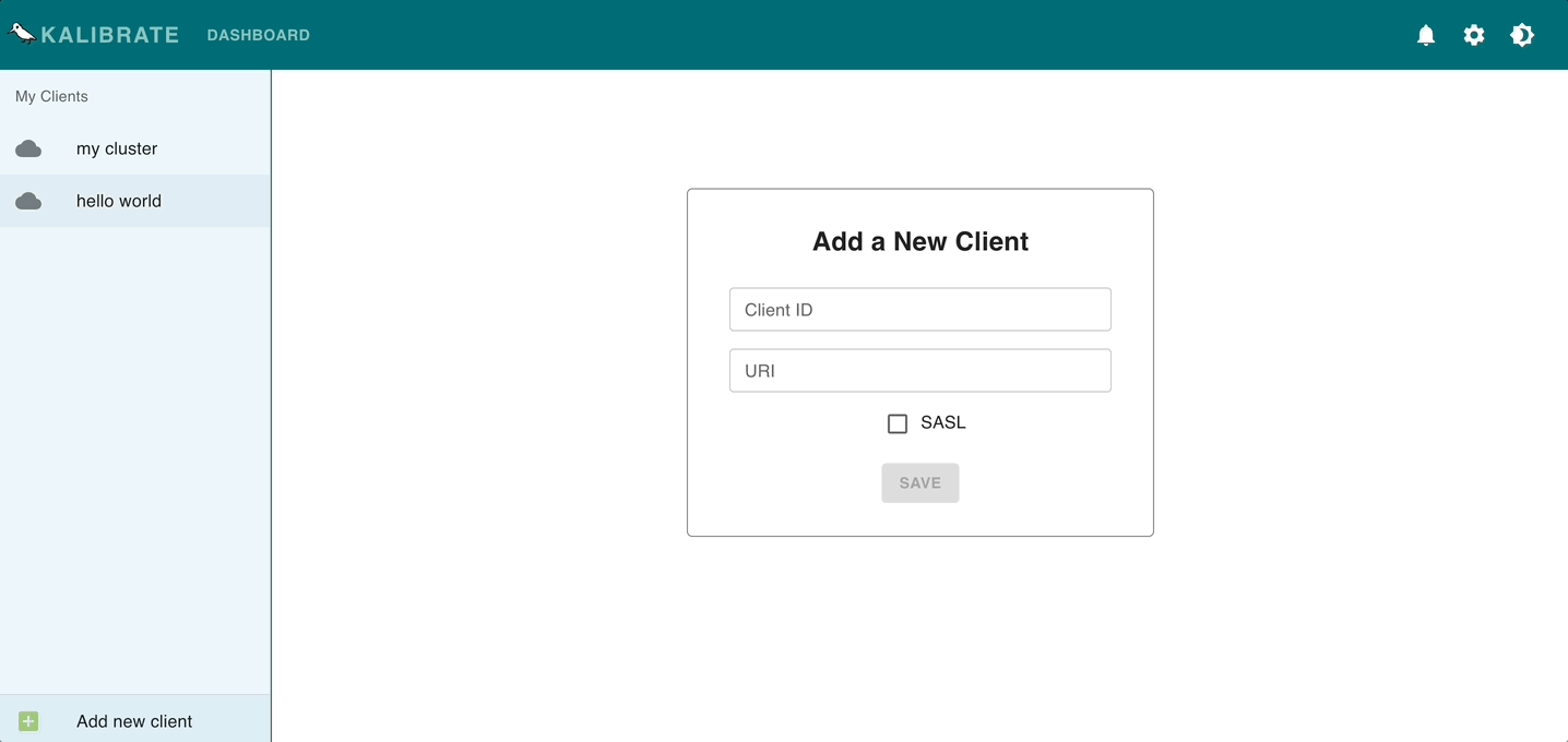 使用Kalibrate,您可以通過給出唯一名稱並輸入有效的URI以及SASL憑據(如果適用)來保存Kafka群集。隨時將新客戶端添加到您的帳戶中,或通過選擇一個保存的客戶並單擊DELETE來刪除一個客戶。