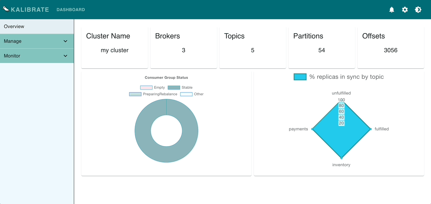 Kalibrate是一種多合一的,免費的開源工具,可使管理和監視Apache Kafka群集變得輕而易舉。它很容易設置並提供友好的用戶體驗。只需登錄或創建一個帳戶,然後連接到您的KAFKA實例即可開始。