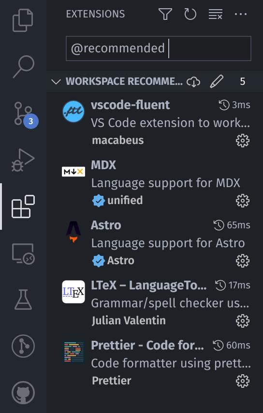 最簡單的編輯器是Visual Studio Code(VSCODE),因為它具有針對Astro和MDX的官方語言擴展。當您在Vscode中打開存儲庫時,您會在右下角提供一個彈出窗口,以安裝一些推薦的擴展名。您還可以在擴展搜索欄中鍵入@recommended ,以瀏覽推薦的擴展名並手動安裝所需的擴展名。