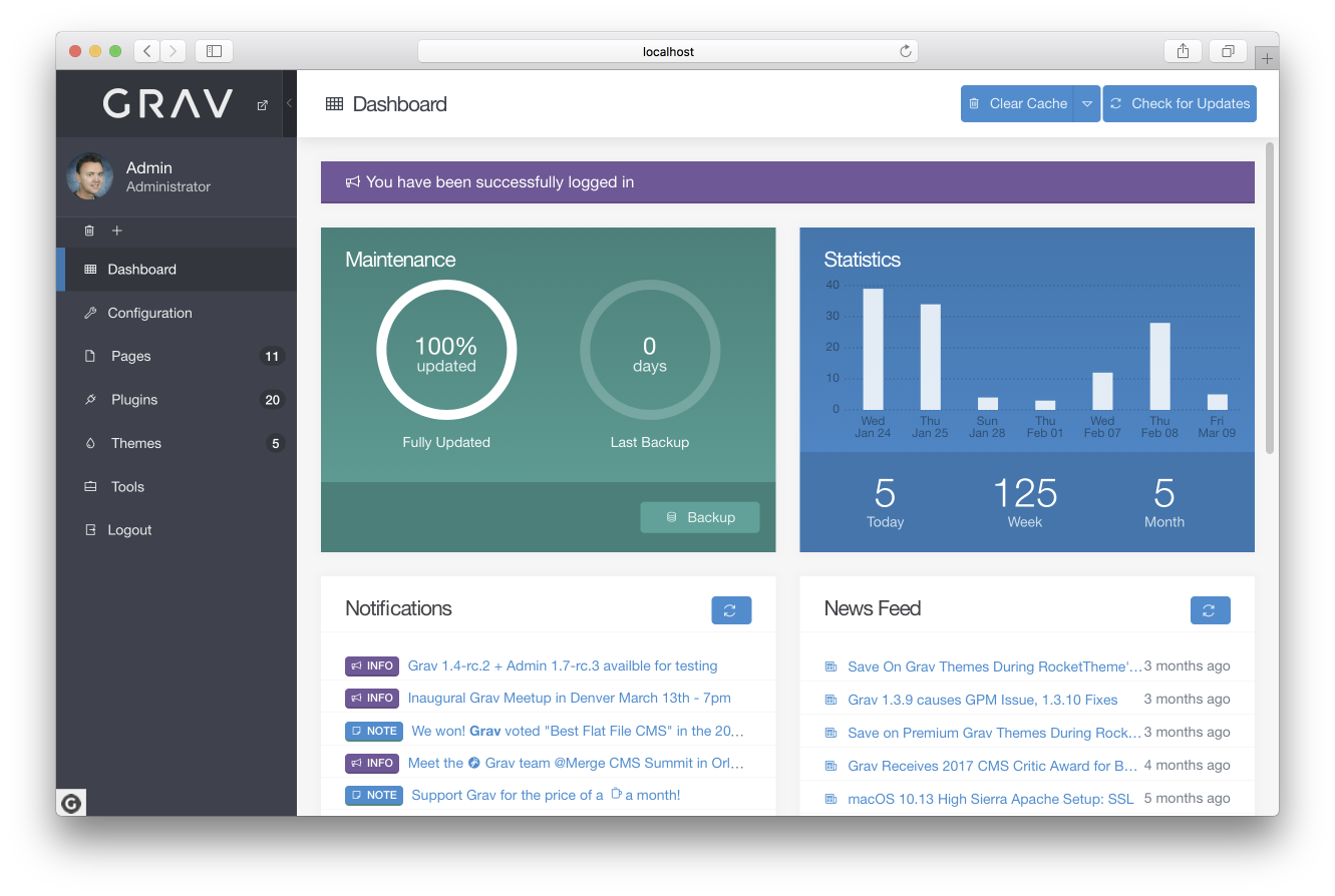 該GRAV的此管理插件是HTML用戶界面,它提供了一種配置GRAV並輕鬆創建和修改頁面的方便方法。這將是一個完全可選的插件,並且不需要任何必要或有效使用墳墓。實際上,管理員提供了有限的視圖,以確保其保持易於使用並且不會壓倒性。我敢肯定,電源用戶仍然希望直接使用配置文件。
